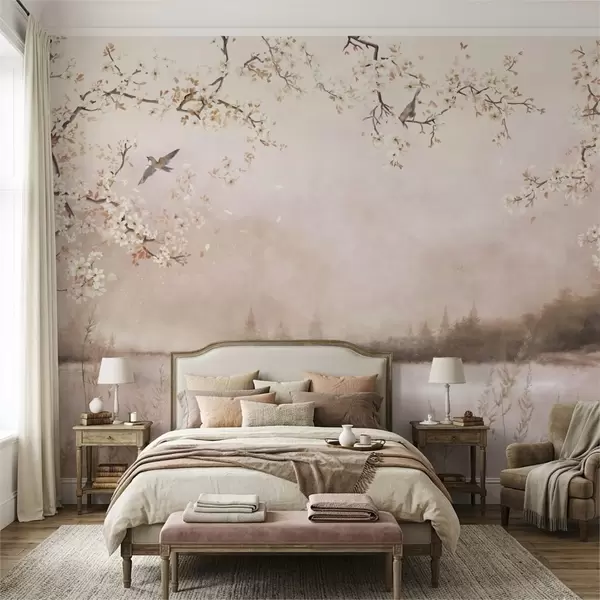 Papier peint Branches fleuries au-dessus d'un lac calme avec des oiseaux dans la brume N° w05155v1