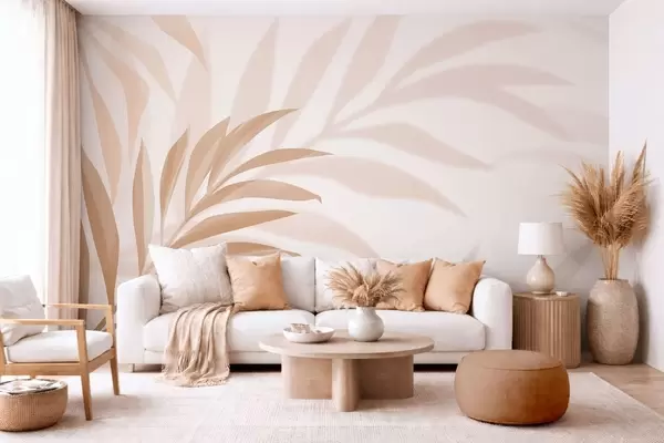 Papier peint grandes feuilles de palmier incurvées dans les tons beige et marron N° w05211