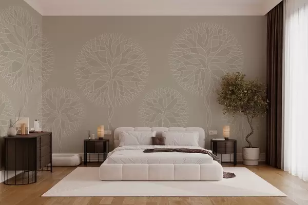 Papier peint Arbres fantaisistes linéaires aux couronnes luxuriantes dans les tons beiges N° w05213v3