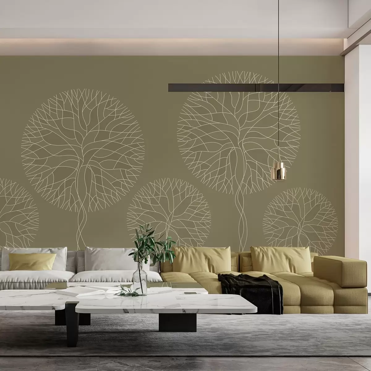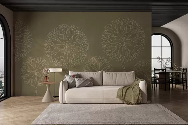 Papier peint Arbres fantaisistes linéaires aux couronnes luxuriantes dans des tons kaki N° w05213v7