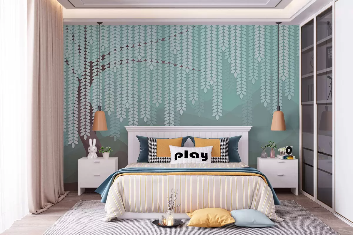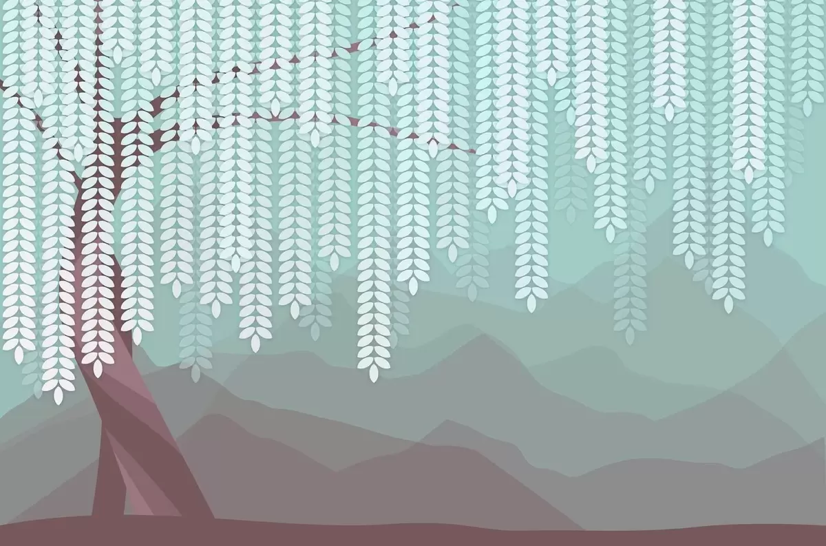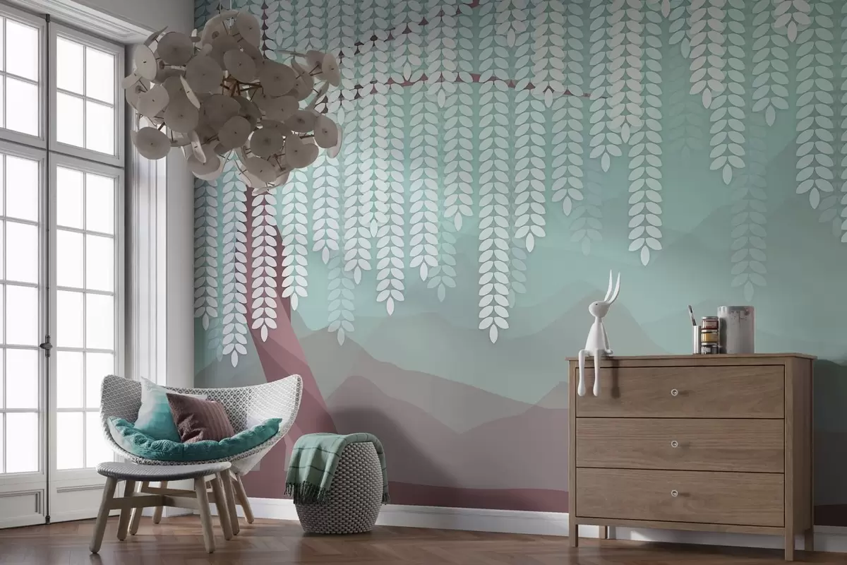 Papier peint Saule stylisé avec des feuilles pendantes sur fond de montagnes minimalistes dans des tons chocolat et turquoise. N° w05232v1