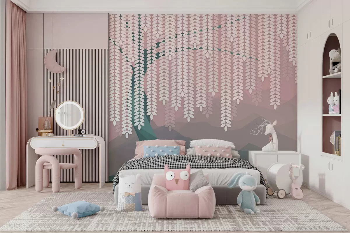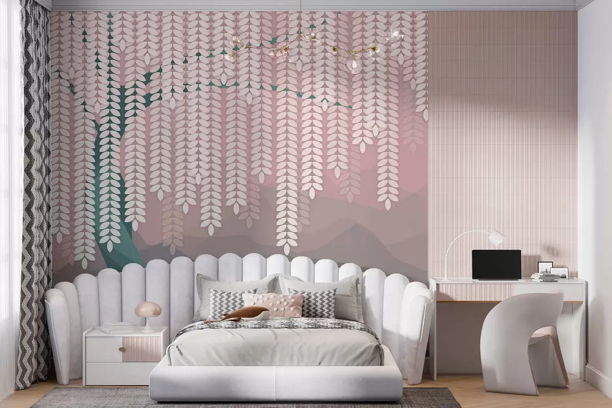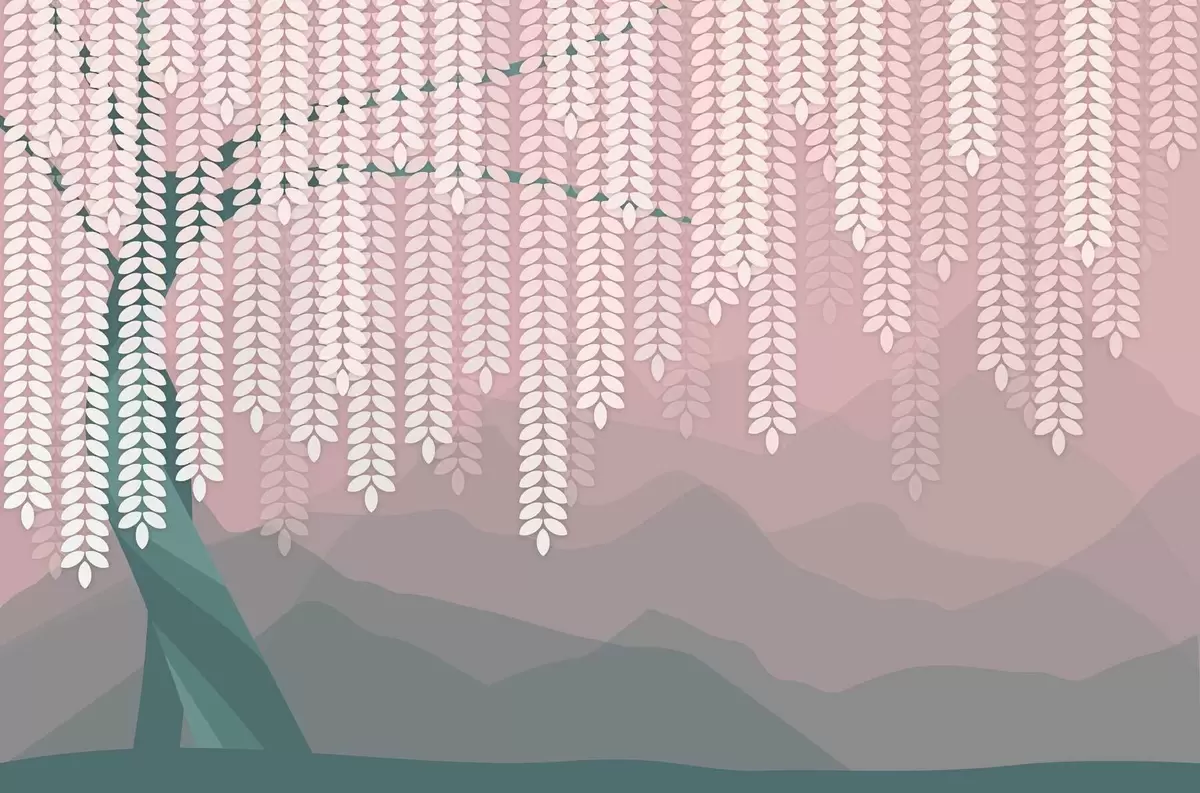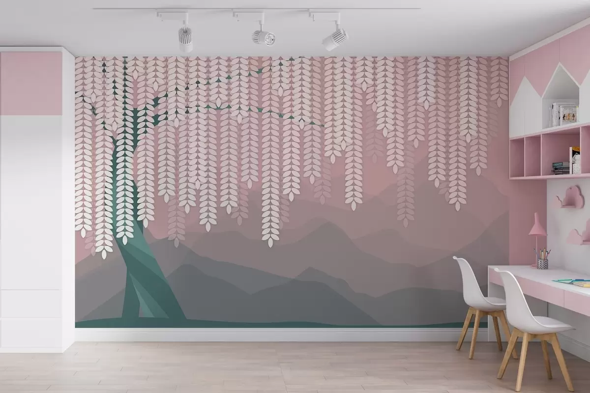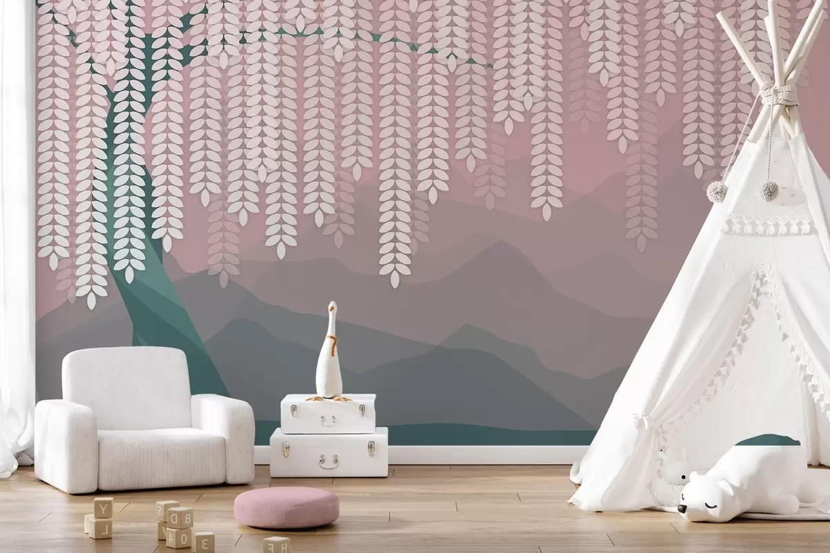Papier peint Saule stylisé aux feuilles pendantes sur fond de montagnes minimalistes dans des tons rose et vert foncé. N° w05232v4