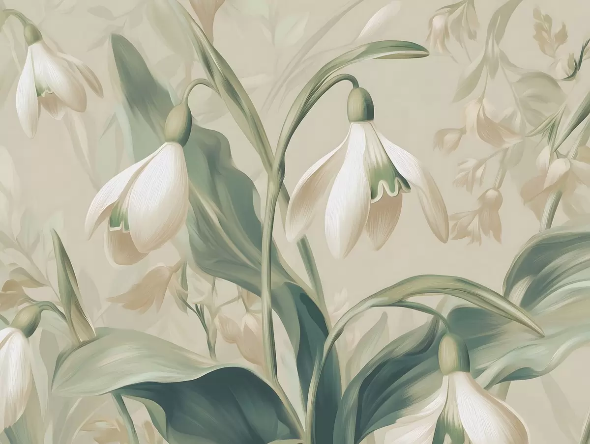 Papier peint perce-neige en fleurs sur fond beige N° w05234