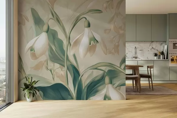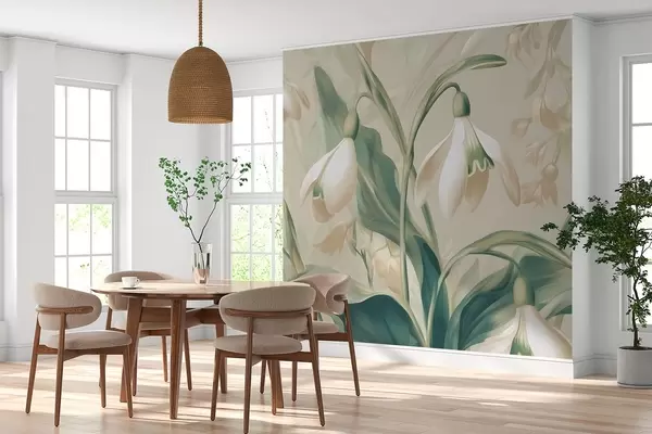 Papier peint perce-neige en fleurs sur fond beige N° w05234