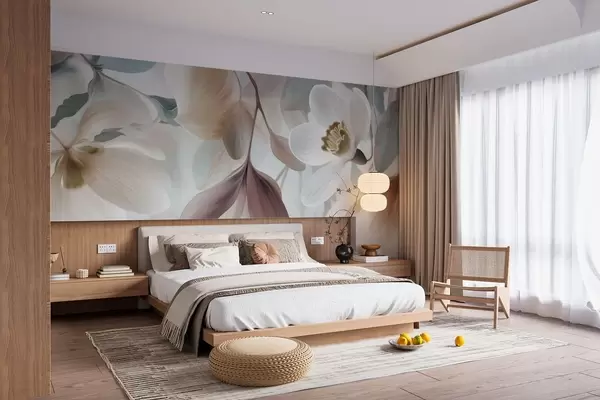Papier peint une composition délicate de fleurs et de feuilles aux tons pastel N° w05240