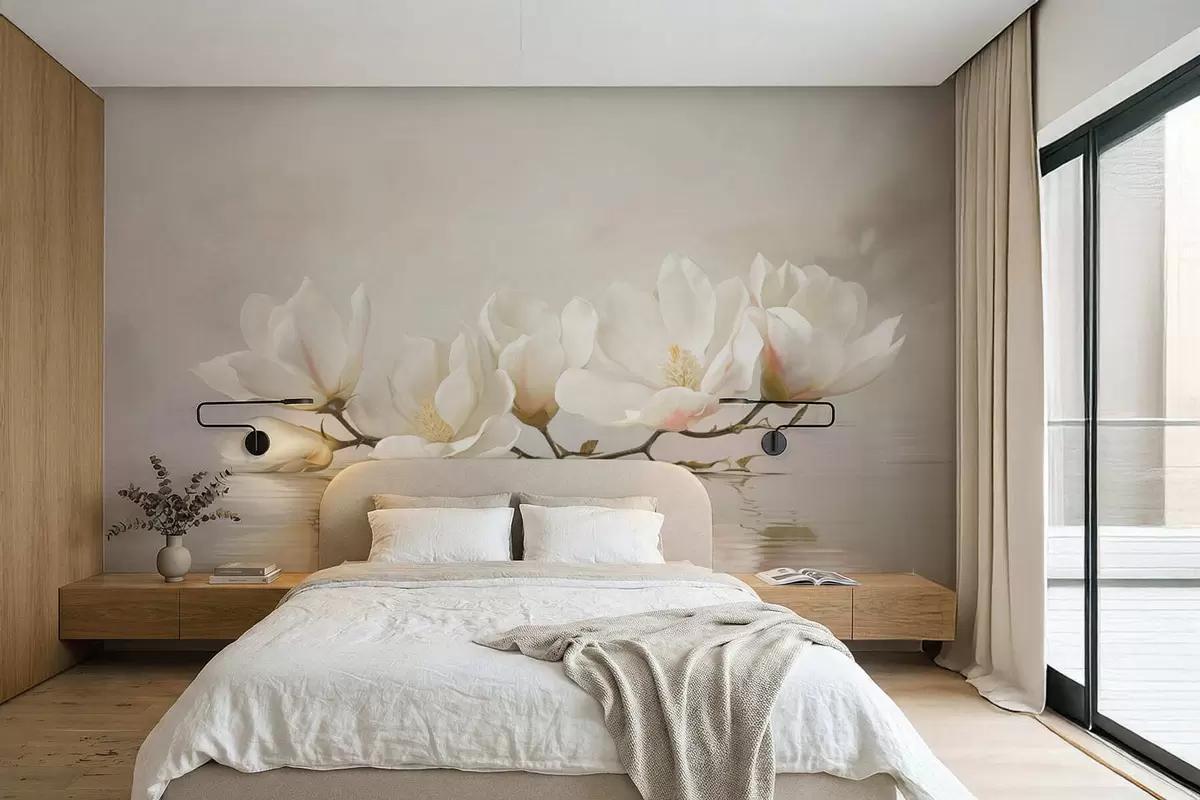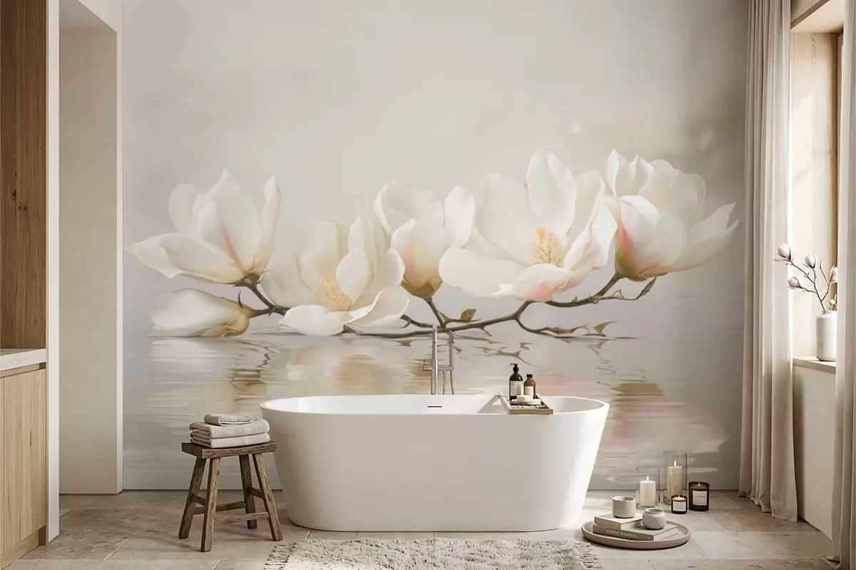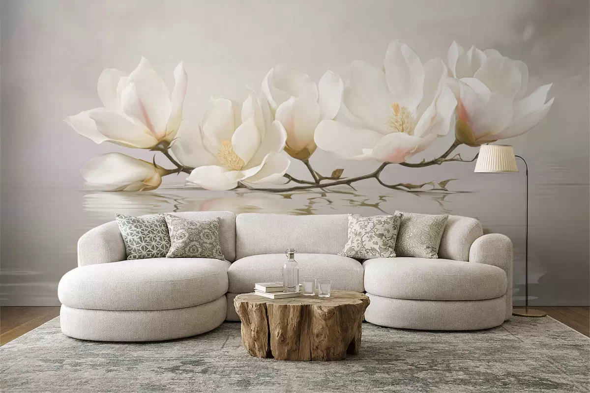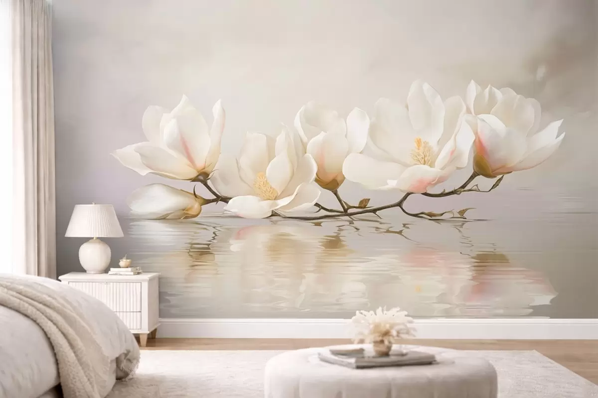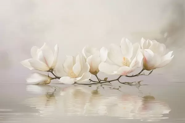 Papier peint Fleurs de magnolia claires sur une branche au-dessus du reflet de l'eau N° w05353