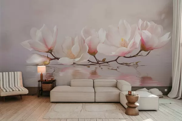 Papier peint Branche de magnolia en fleurs au-dessus du reflet d'une eau calme N° w05353v1