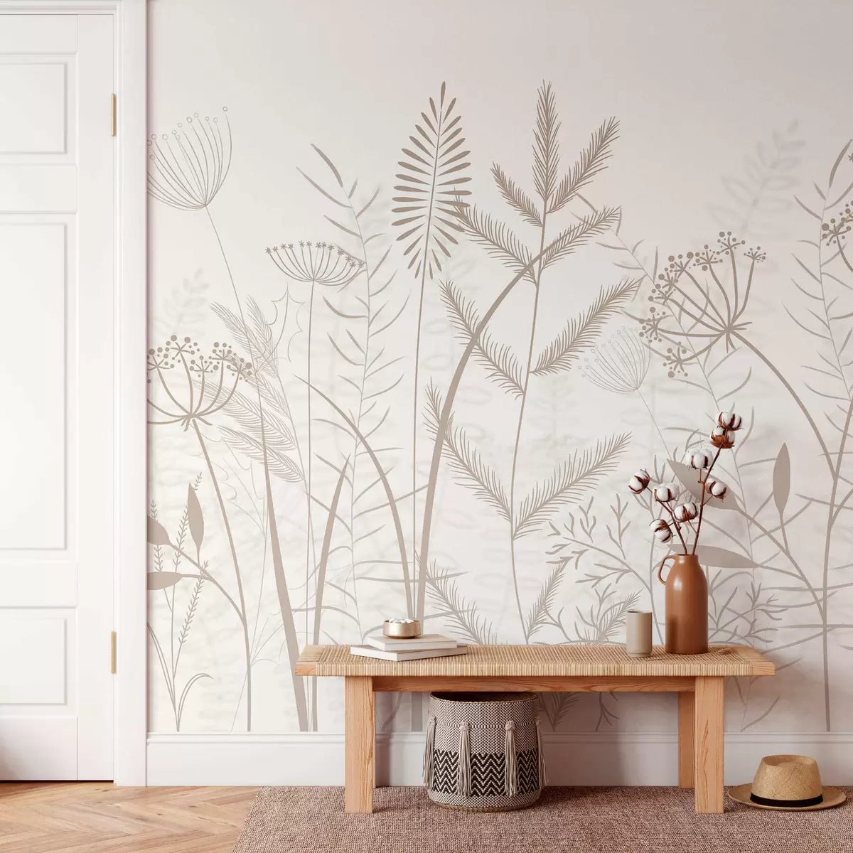 Papier peint des herbes sauvages et des fleurs délicatement peintes à la main sur fond blanc N° w05383v2