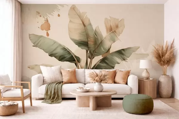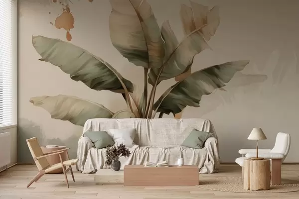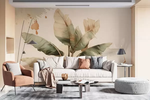 Papier peint un grand bouquet pittoresque de feuilles de bananier orné de touches de couleur au style rétro N° w05384