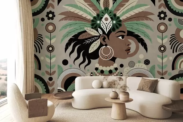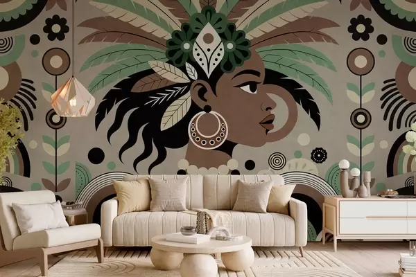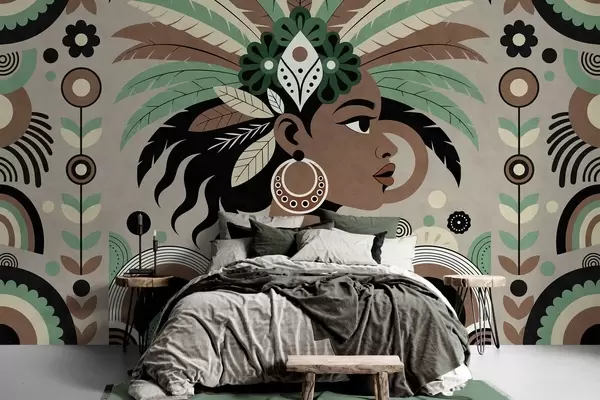 Papier peint un motif élégant d'inspiration africaine dans des tons de vert, de marron et de beige N° w05389v1