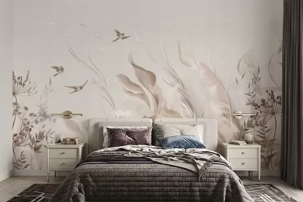Papier peint Des plumes douces, des herbes et des oiseaux dans des tons clairs N° w05395