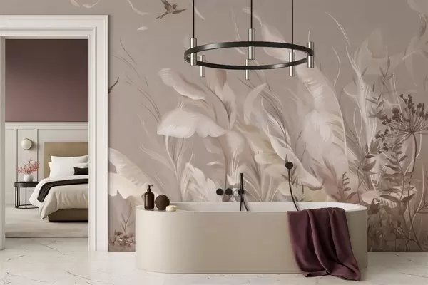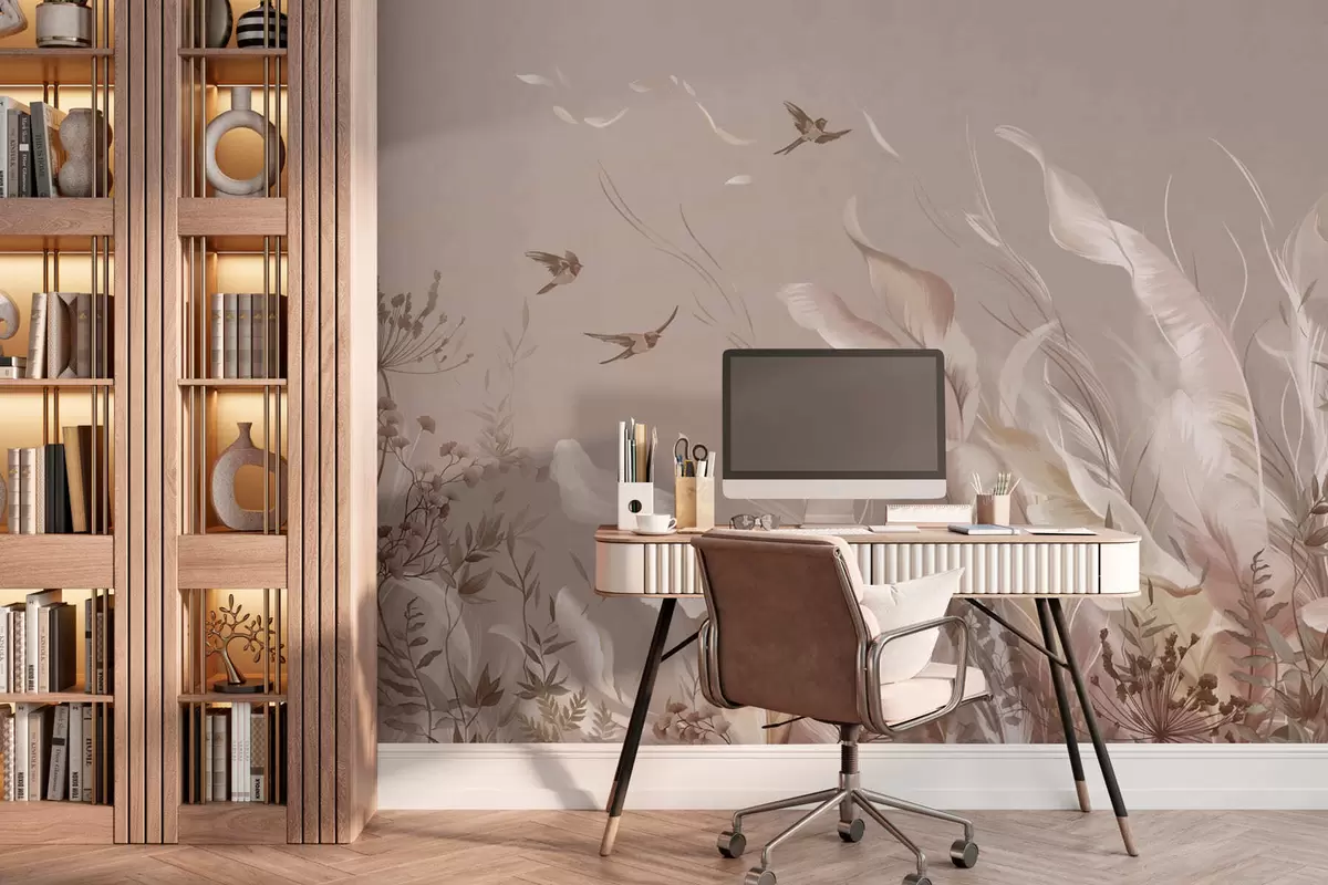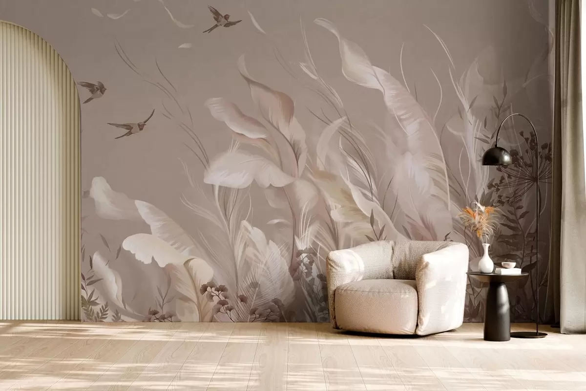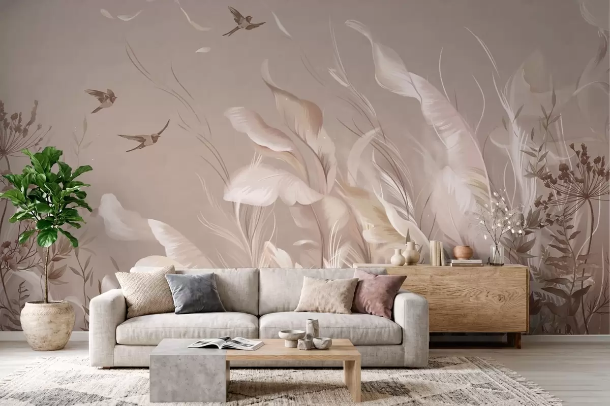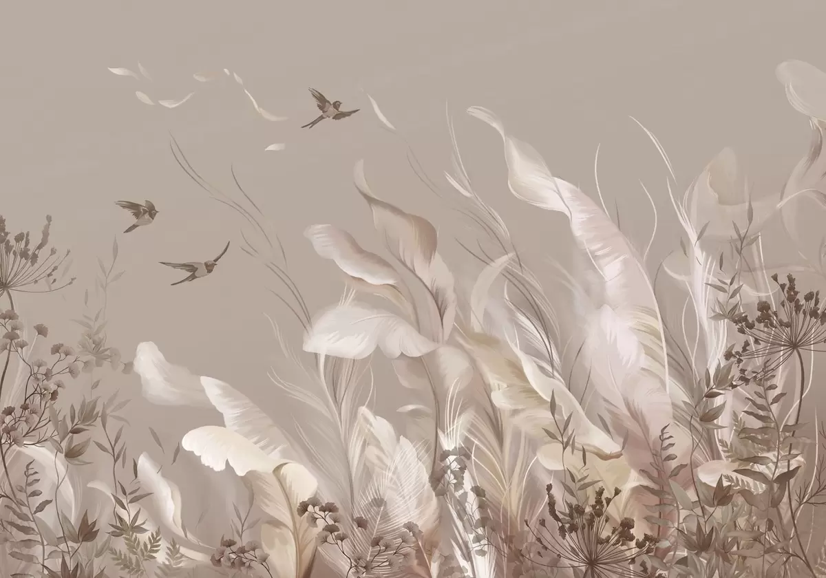 Papier peint Plumes légères et plantes accompagnées d'oiseaux aux tons pastel N° w05395v1