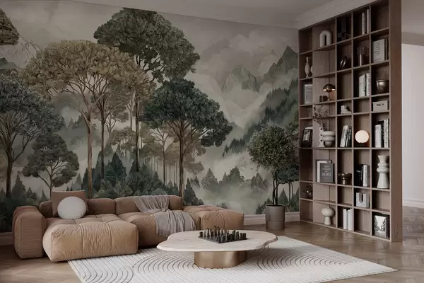 Papier peint Paysage de montagne avec une forêt aux tons doux N° w05410v1