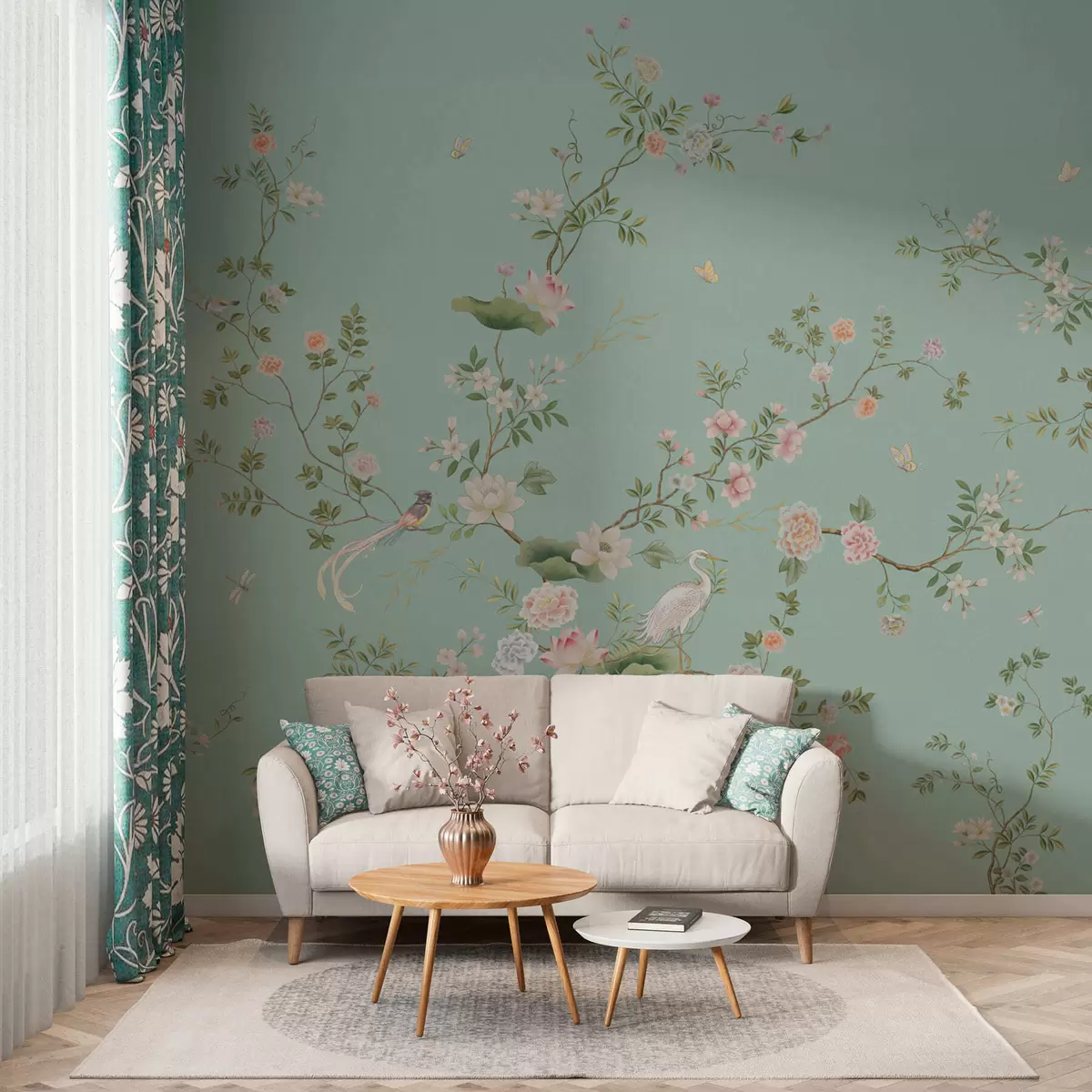 Papier peint Branches fleuries avec des oiseaux sur fond bleu N° w05416v1
