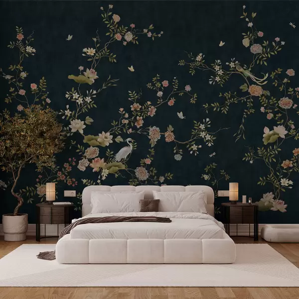 Papier peint Branches fleuries avec des oiseaux sur fond sombre N° w05416v3