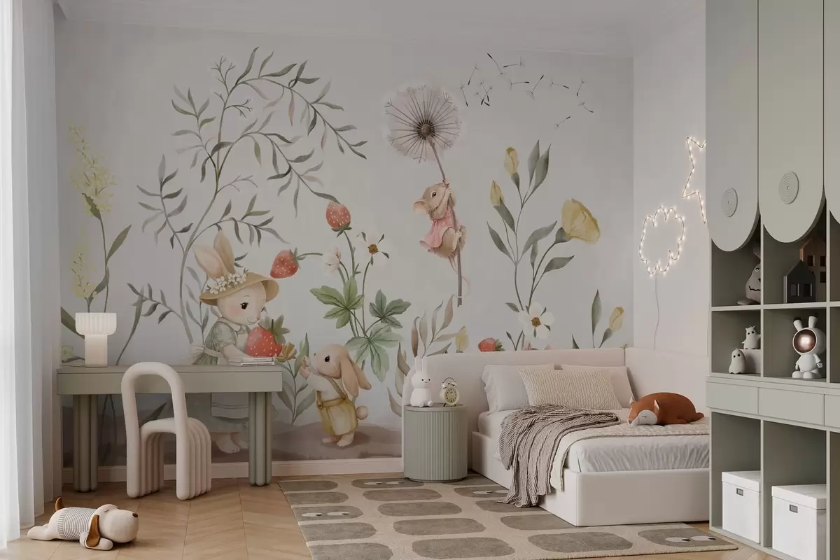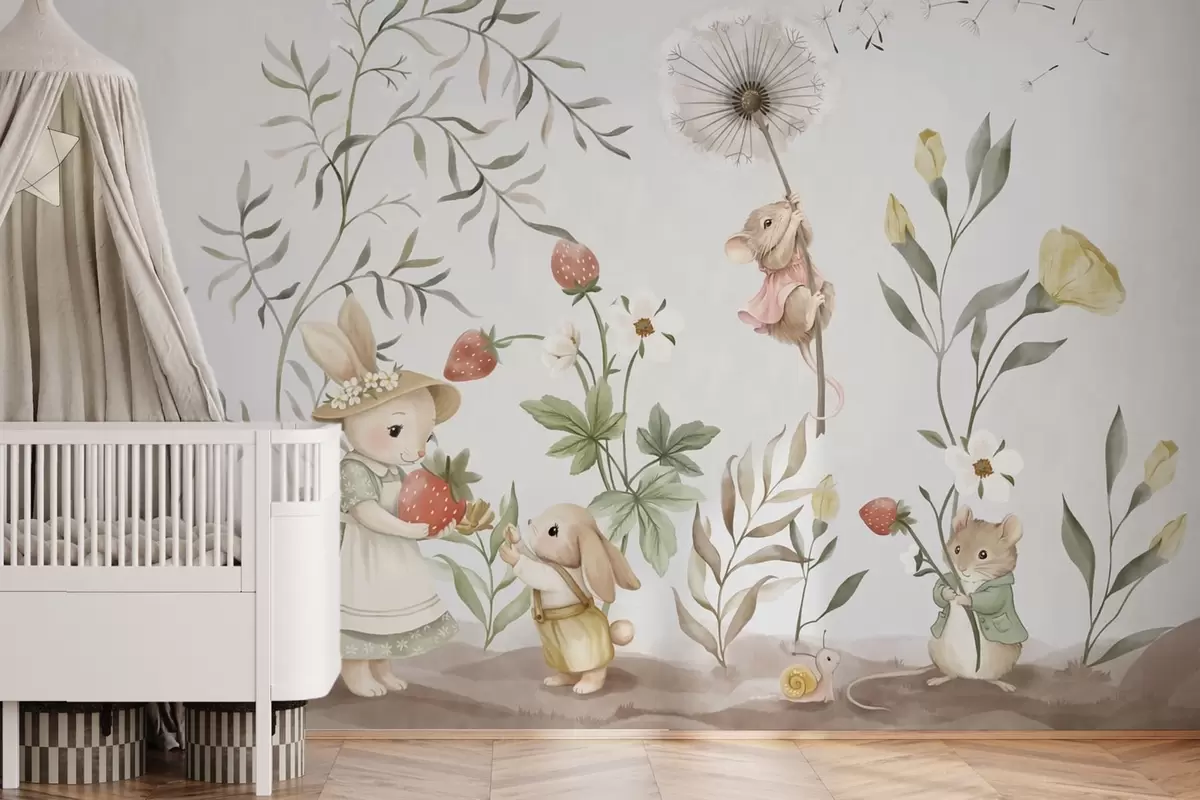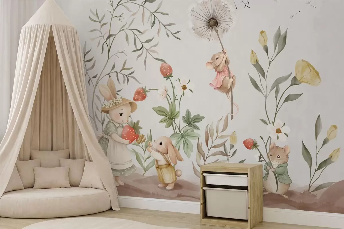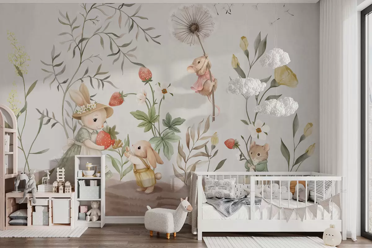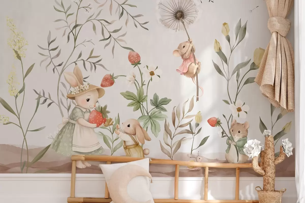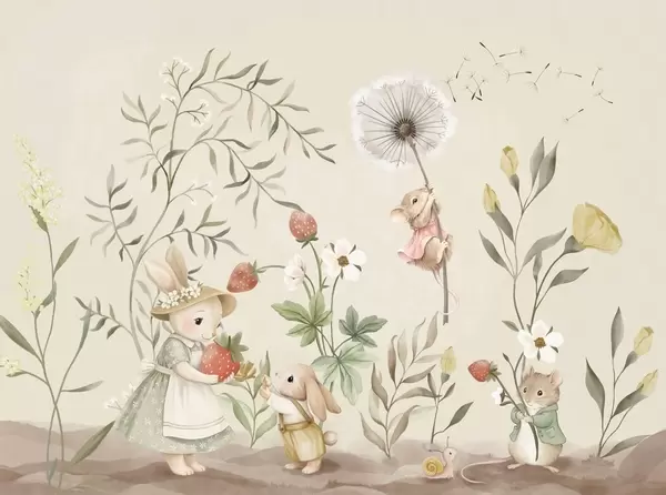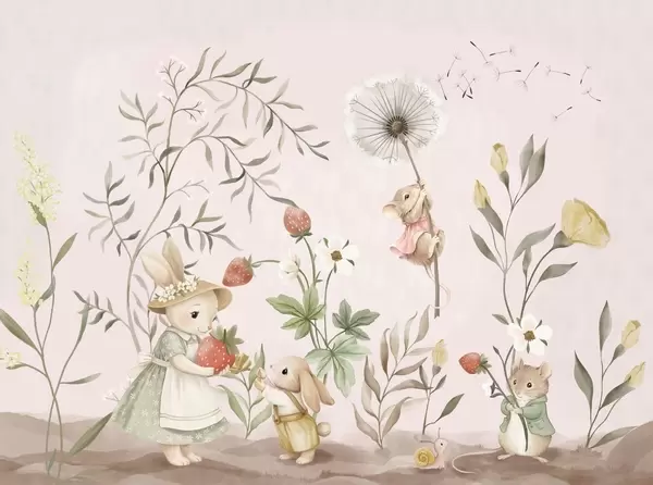 Papier peint Illustration pour enfants représentant un lapin et une souris parmi des plantes et des fleurs N° w05422