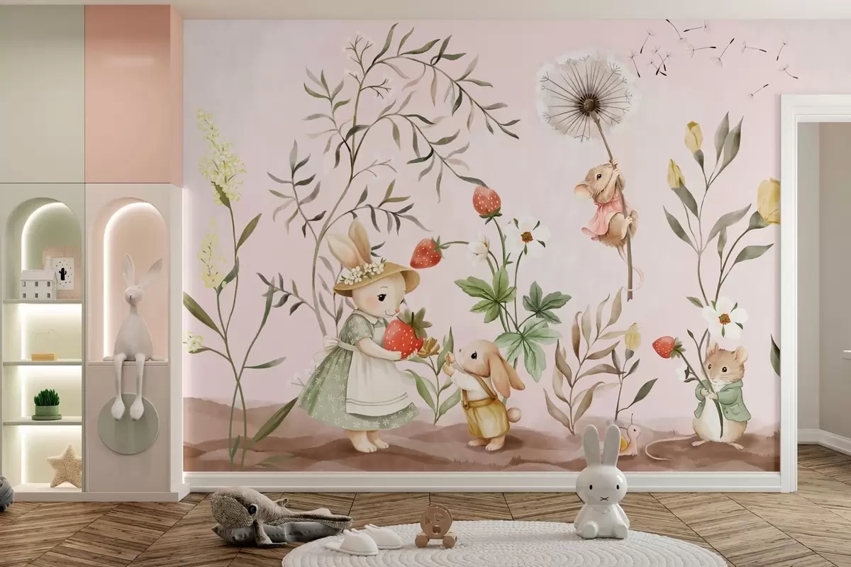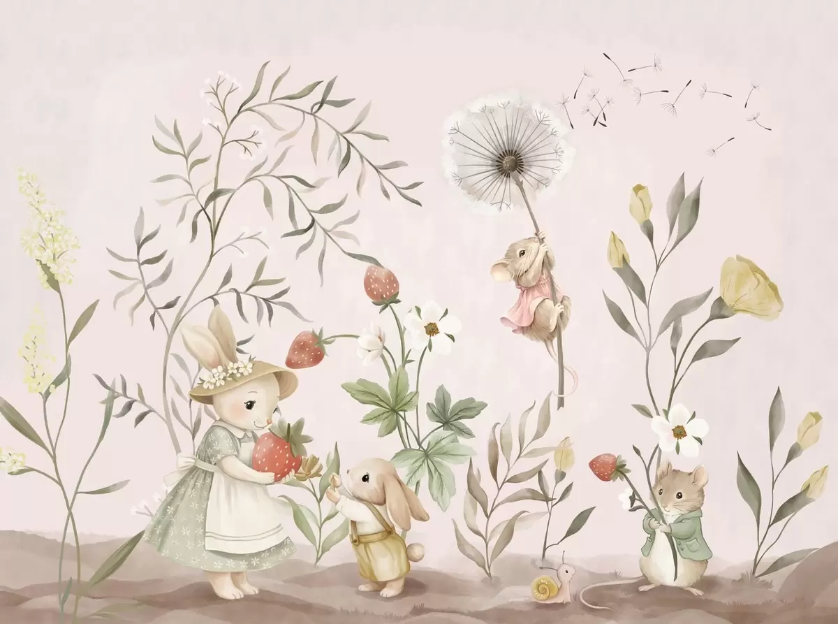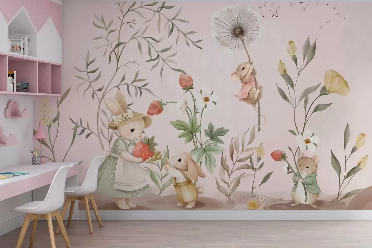Papier peint Illustration d'animaux avec des fraises sur fond rose pâle N° w05422v1