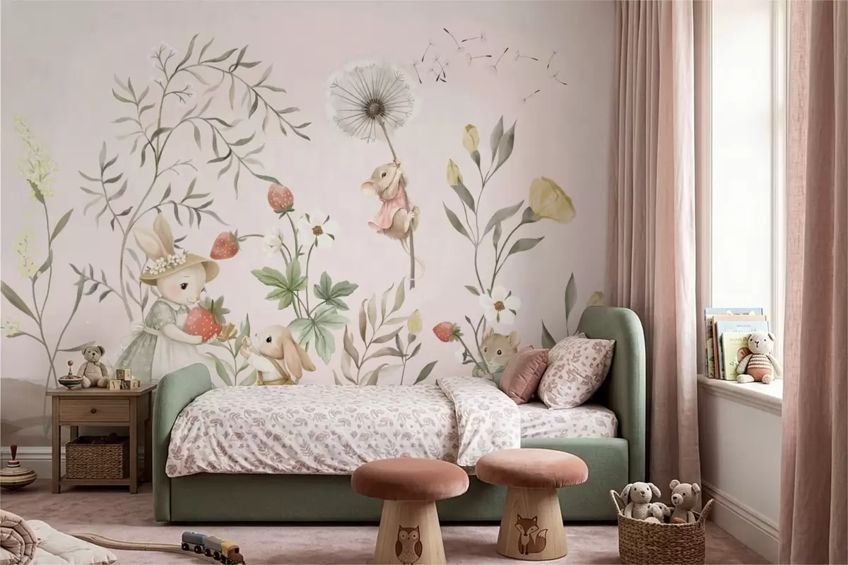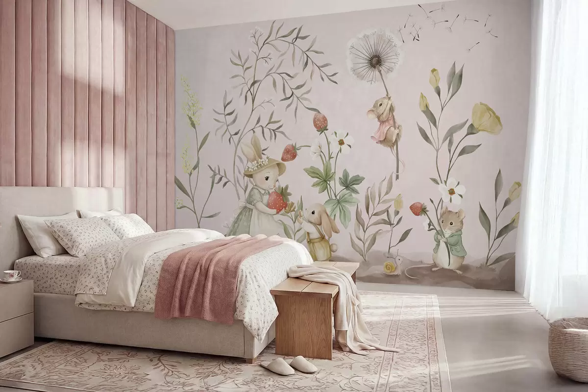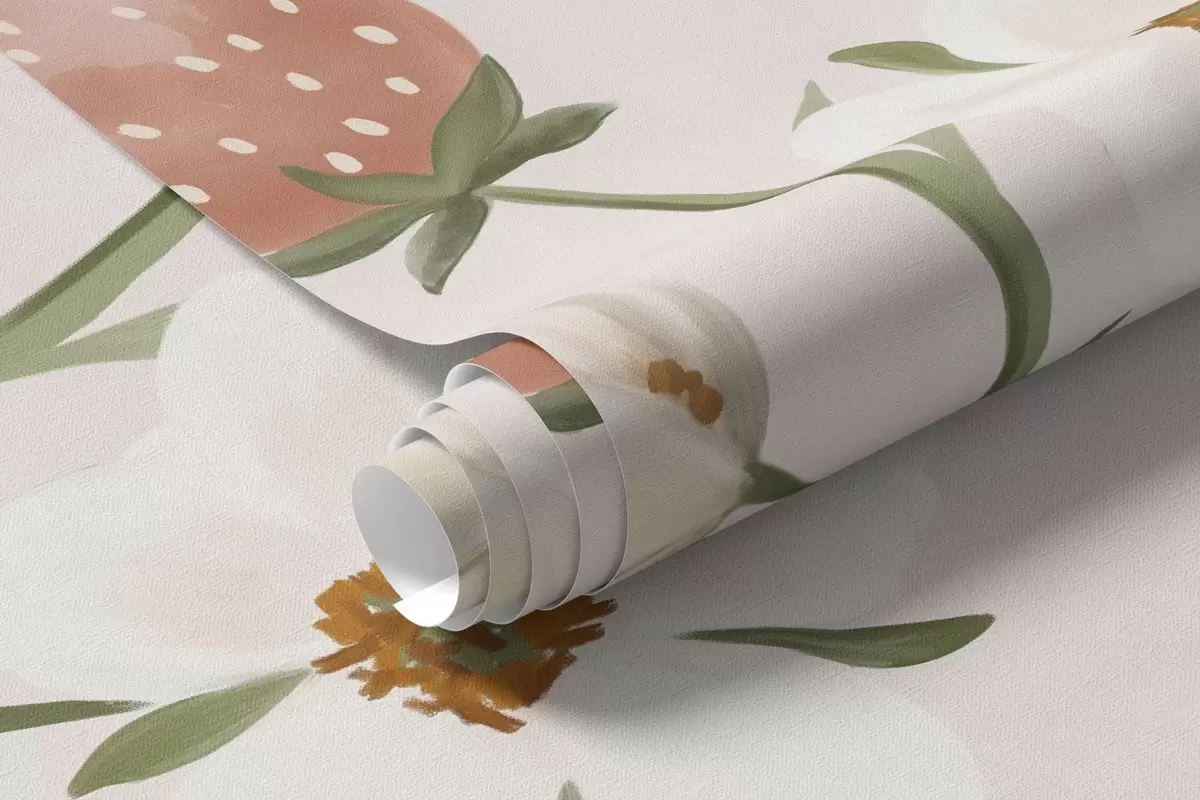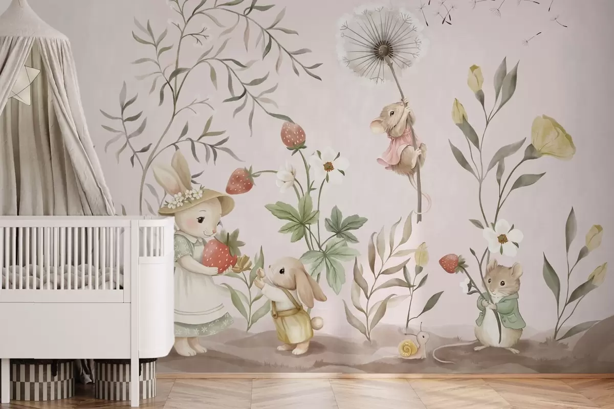 Papier peint Illustration d'animaux avec des fraises sur fond rose pâle N° w05422v1
