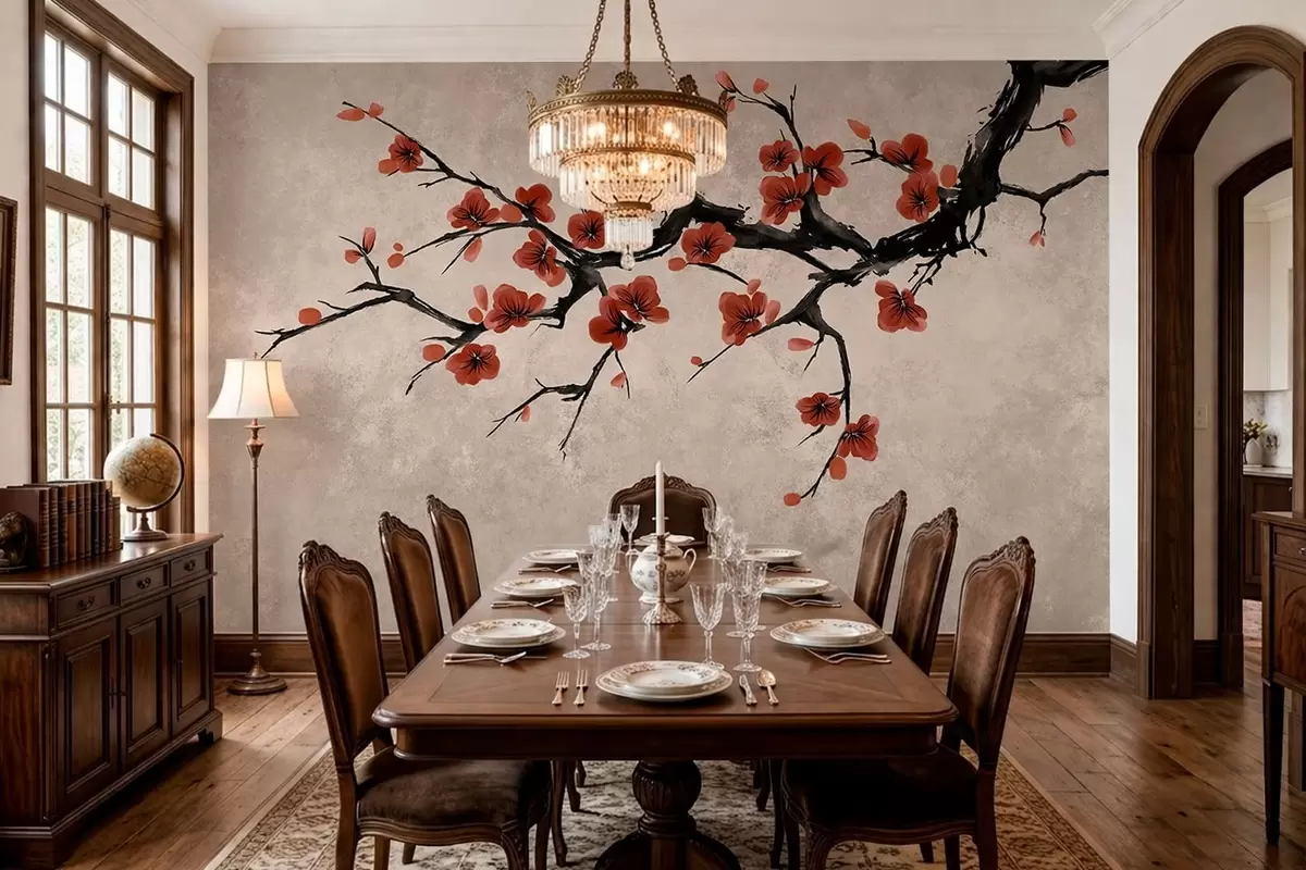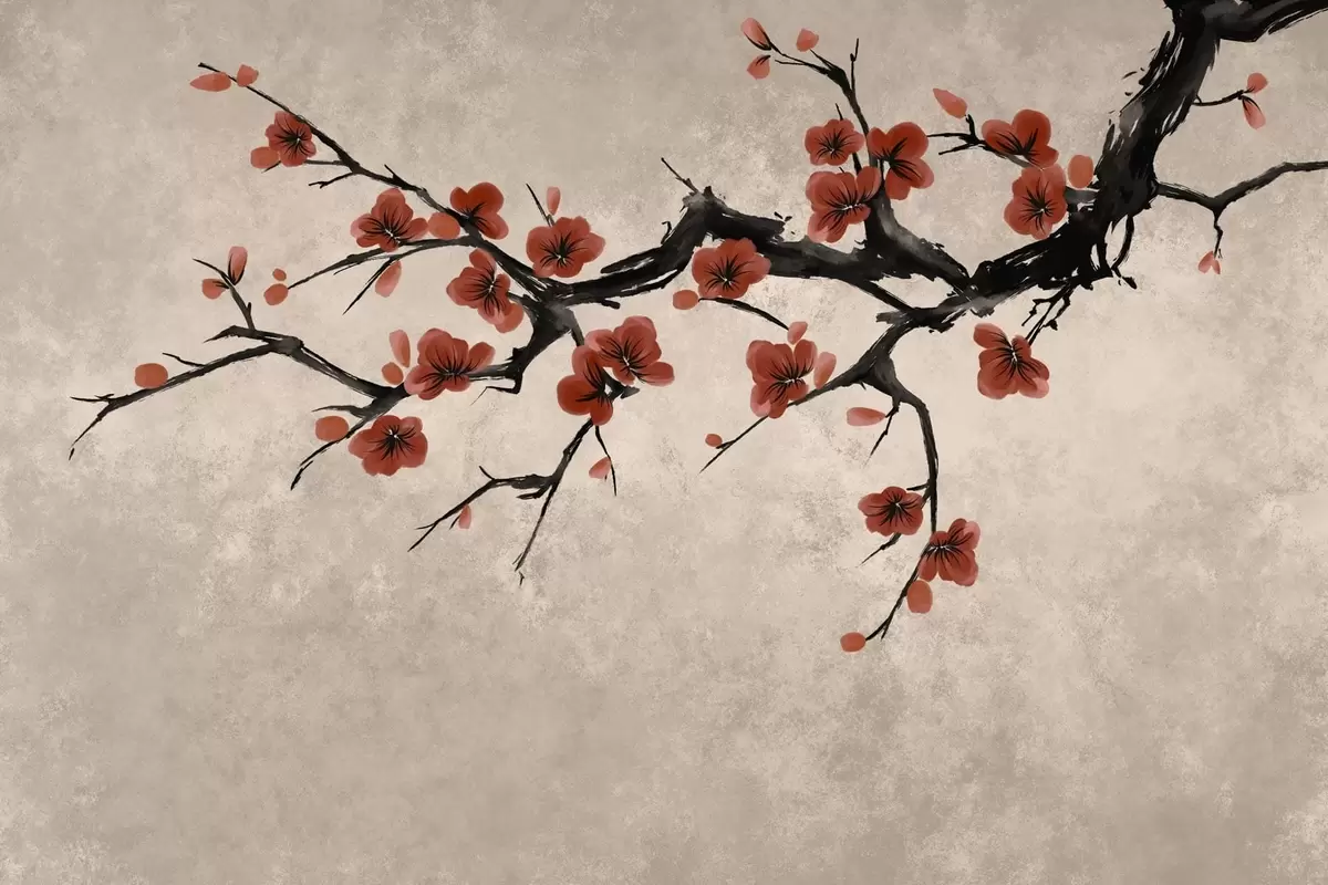 Papier peint Branche fleurie de style oriental sur fond beige N° w05425v4