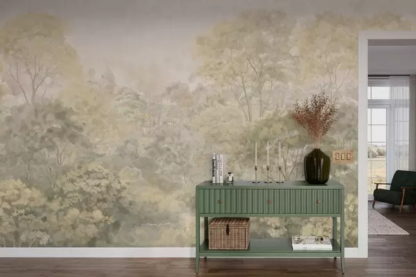 Papier peint Paysage forestier vintage aux tons verts discrets N° w05433