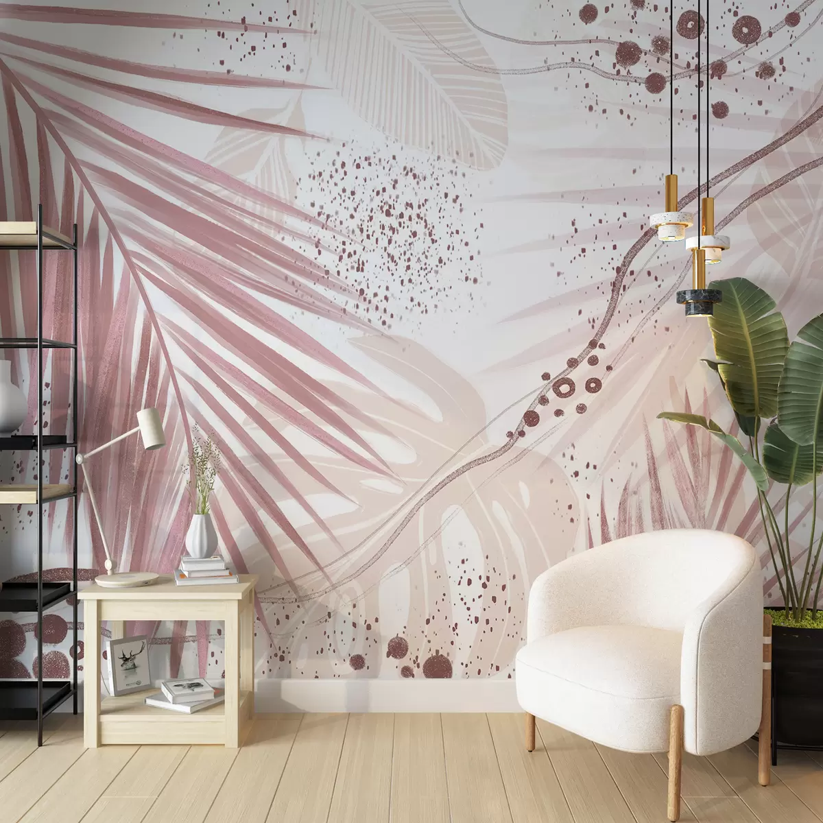 Papier peint Feuilles et frondes de palmier rose tropical, avec des formes abstraites et des éclaboussures dans les tons rose et blanc N° w07918v1