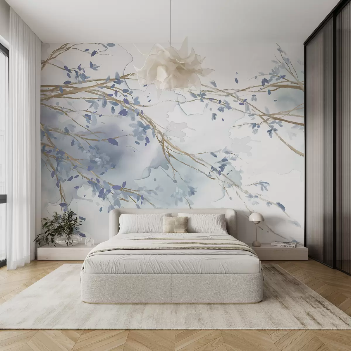 Papier peint Branches florales bleues et blanches délicates avec fond aquarelle doux et flou N° w07919