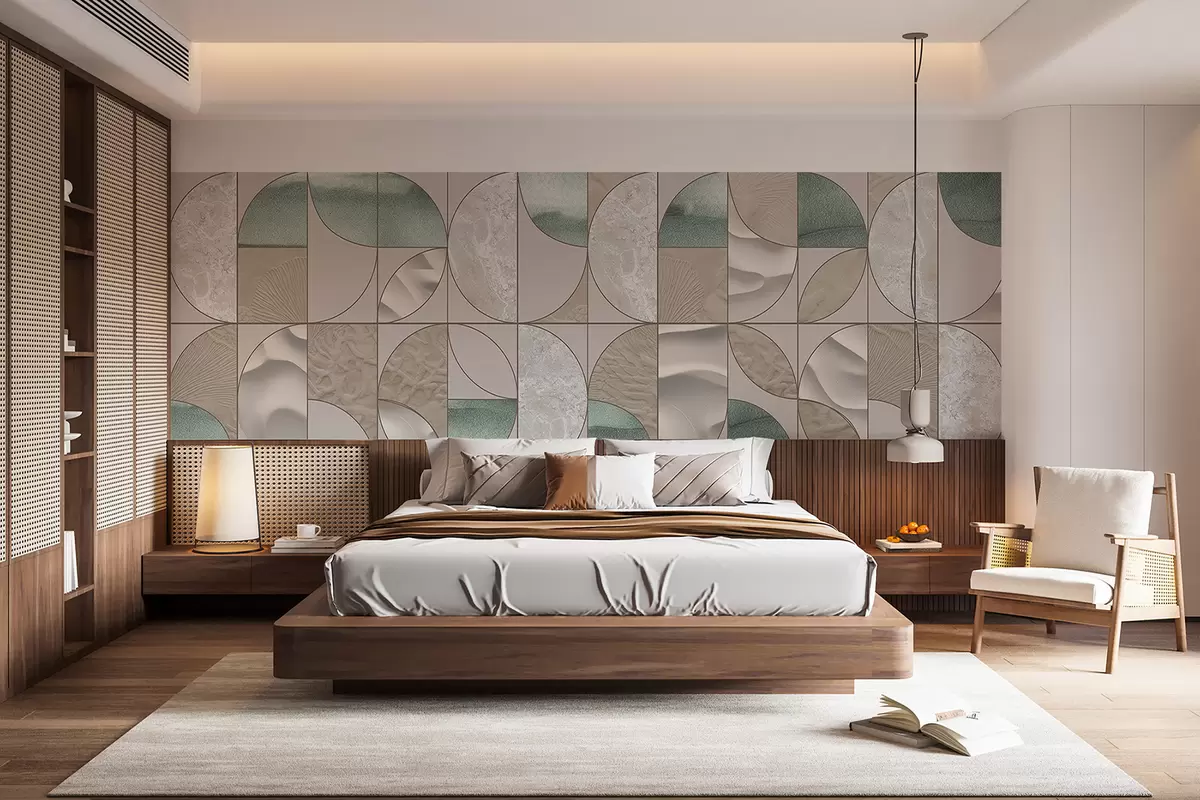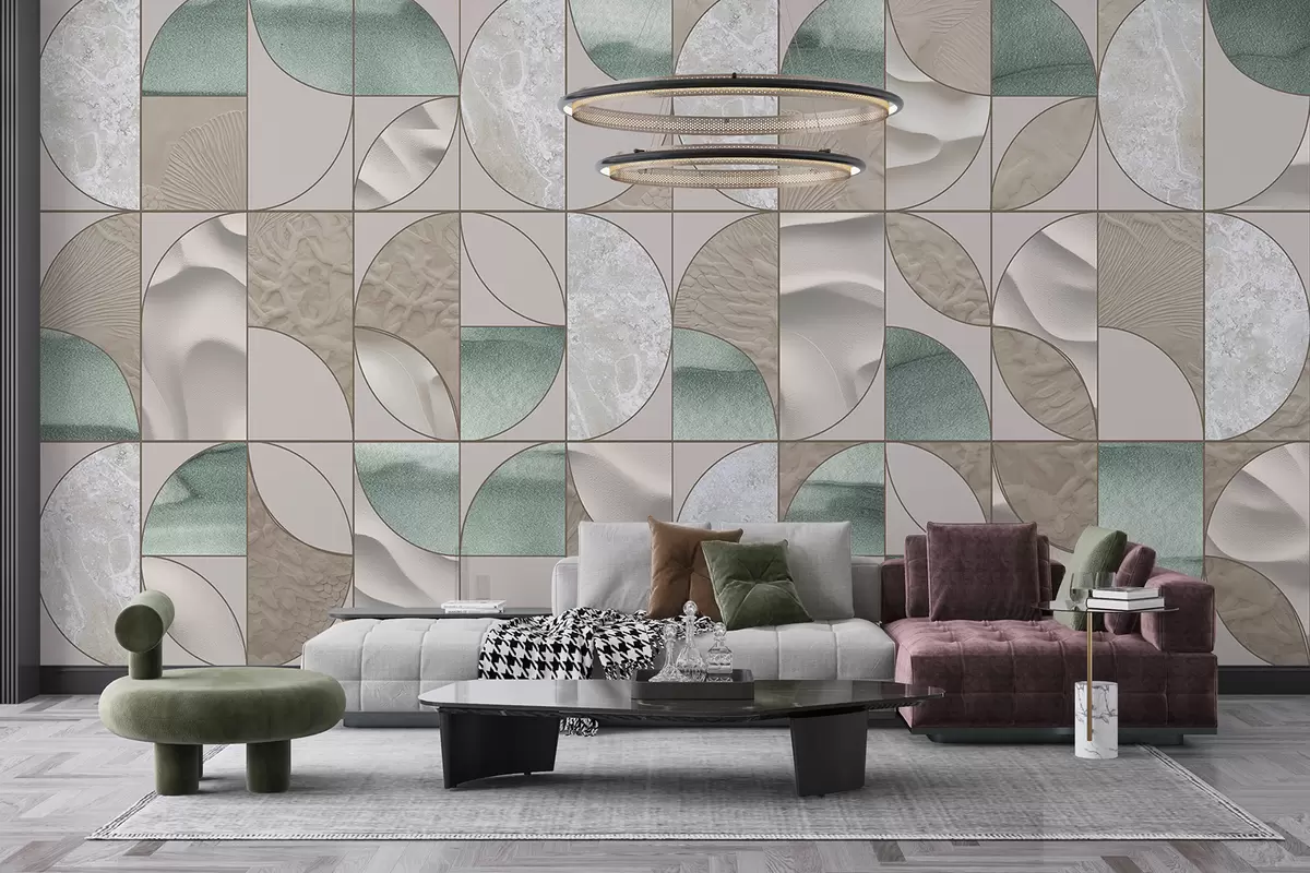 Papier peint Un motif géométrique de textures vertes, beiges et blanches disposées dans un motif abstrait répétitif N° w07928