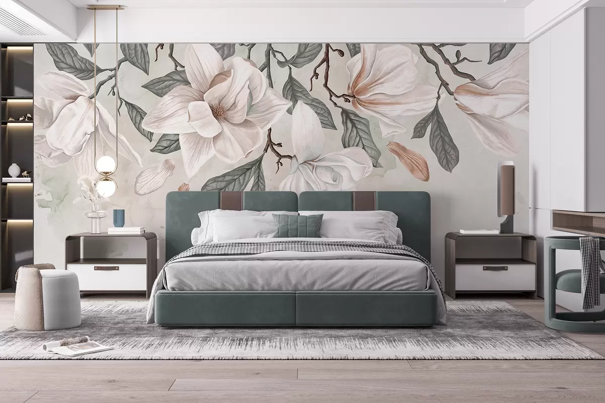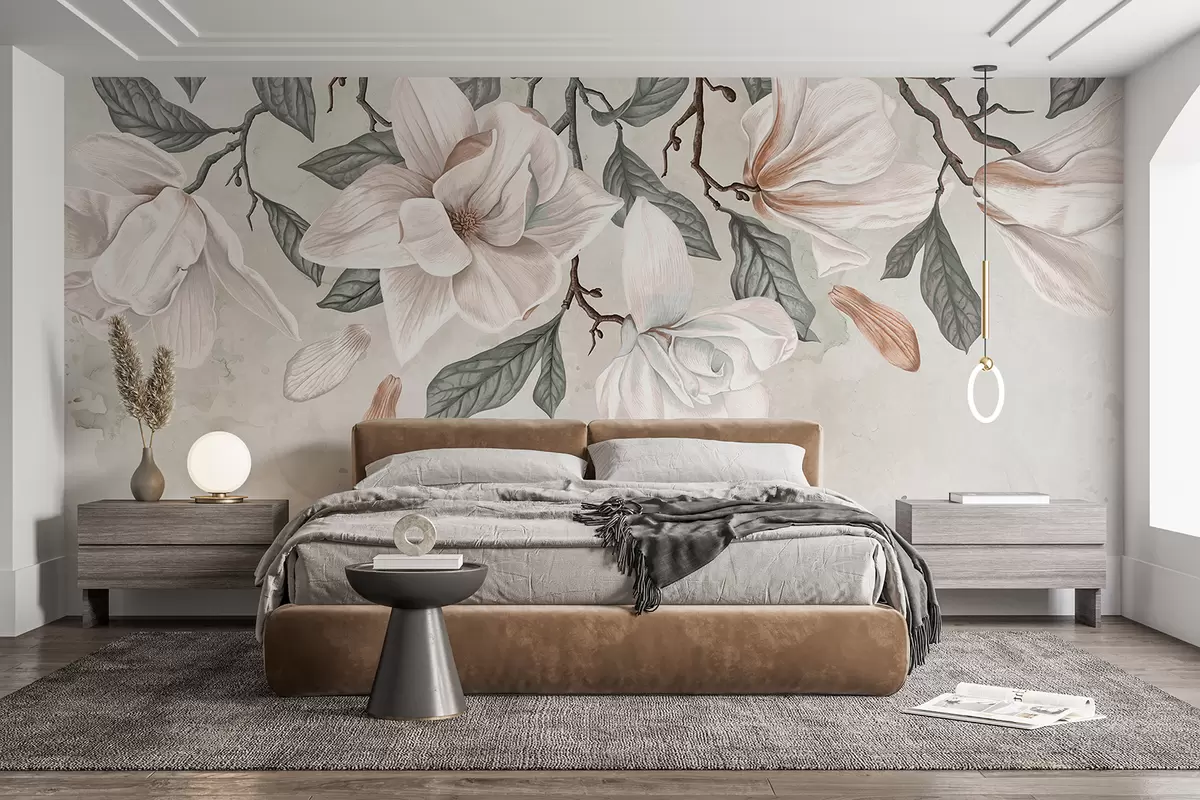 Papier peint Délicates fleurs de magnolia roses et blanches avec des feuilles vertes sur fond clair, une composition florale douce N° w07977