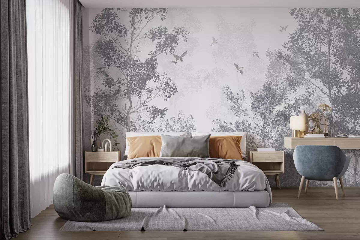 Papier peint Arbres aux feuilles et branches grises avec des oiseaux volant dans le ciel, fond blanc N° w07982v1
