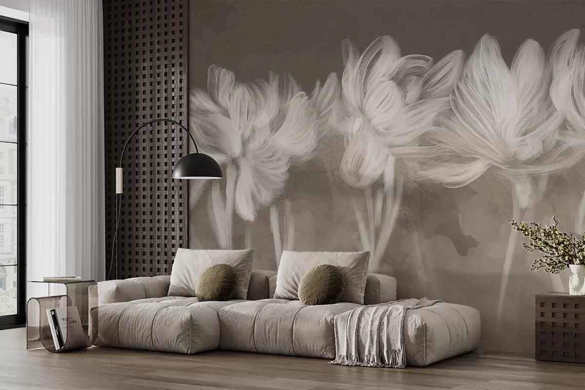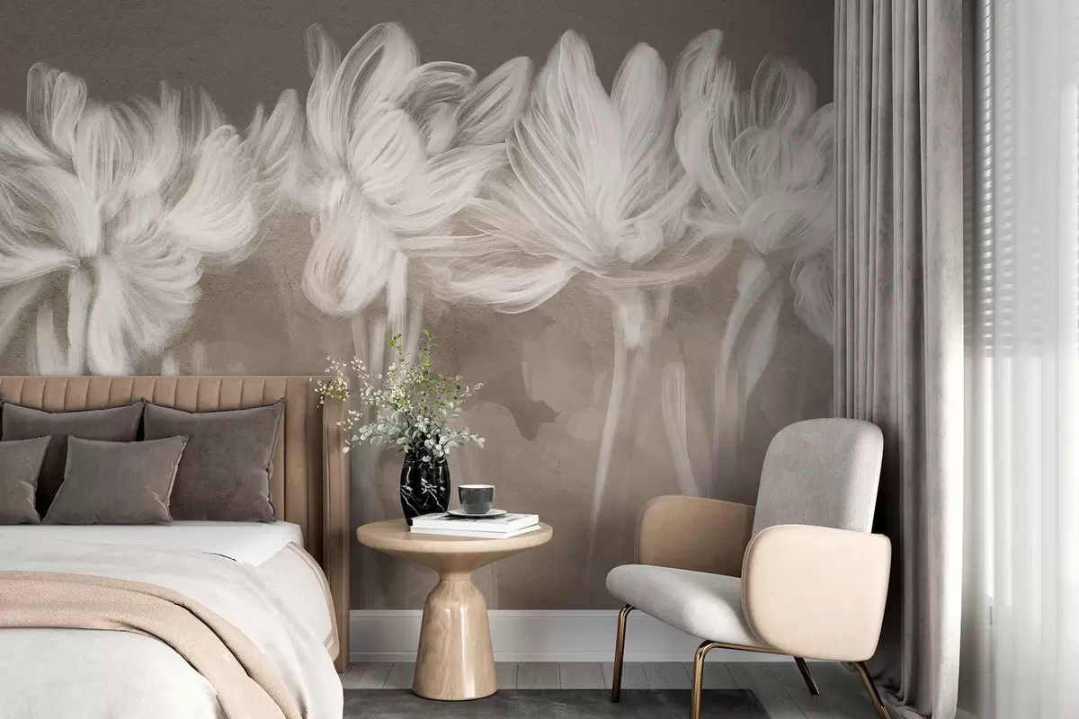 Papier peint Silhouettes florales transparentes blanches de minimalisme doux sur fond texturé marron N° w07986
