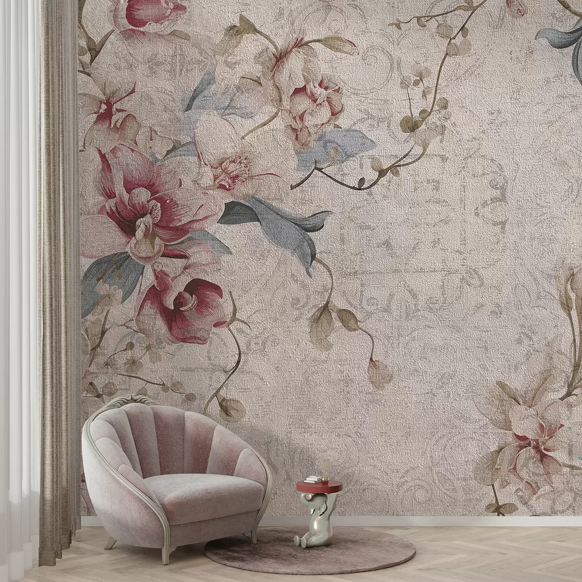 Papier peint Un motif floral vintage avec de délicates fleurs roses et blanches, des feuilles sur un fond beige clair N° w08149