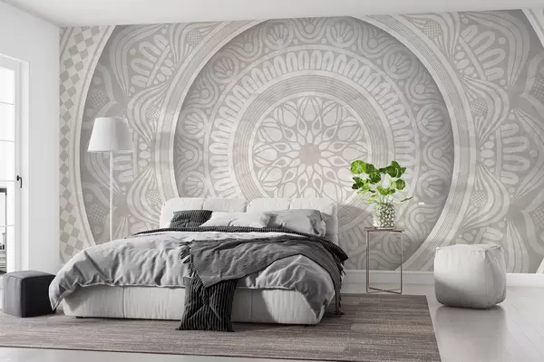 Papier peint Un imprimé mandala symétrique détaillé en gris et blanc avec des cercles concentriques et des formes géométriques N° w08182