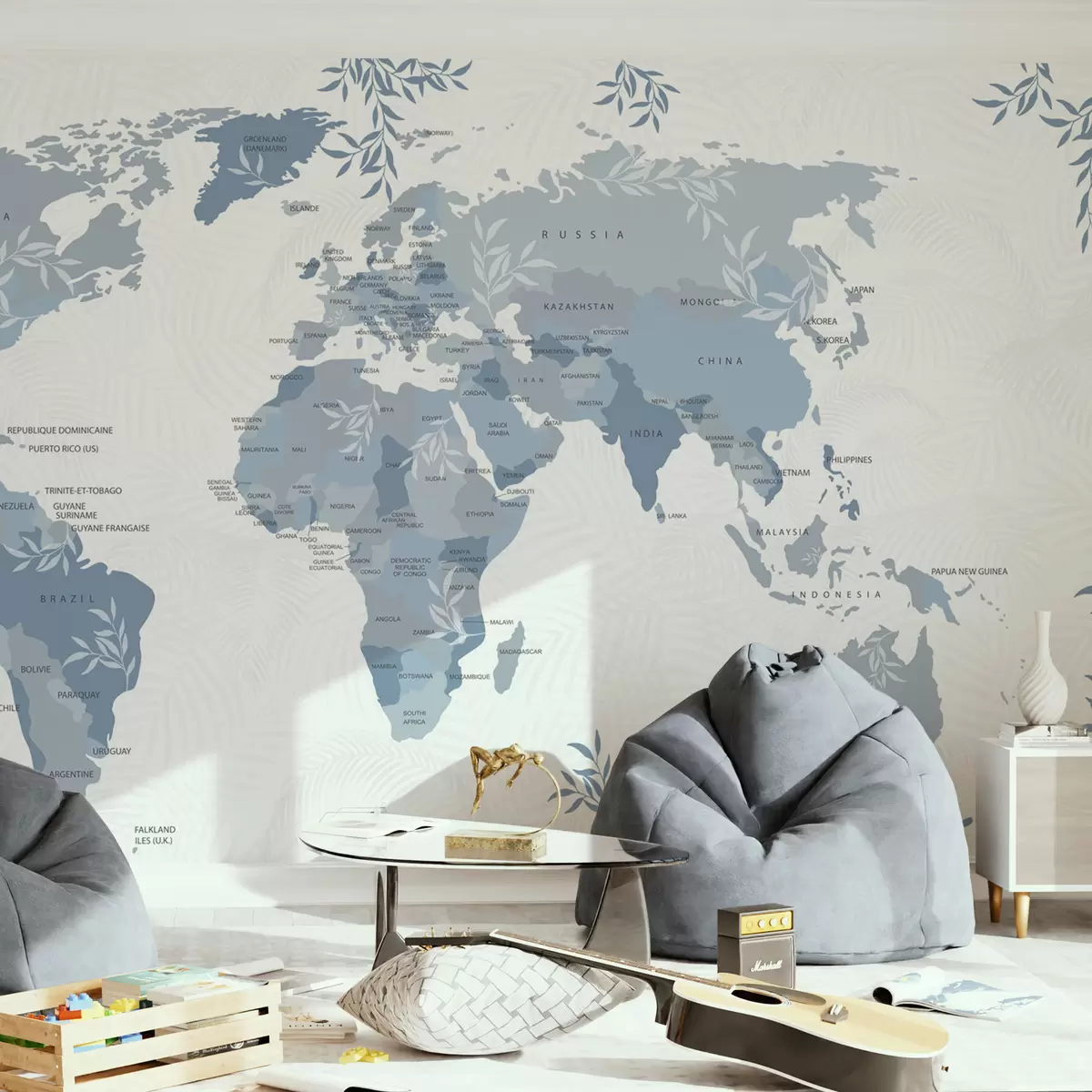 Papier peint Carte du monde élégante avec des feuilles et des plantes de couleur bleue N° w08211v4