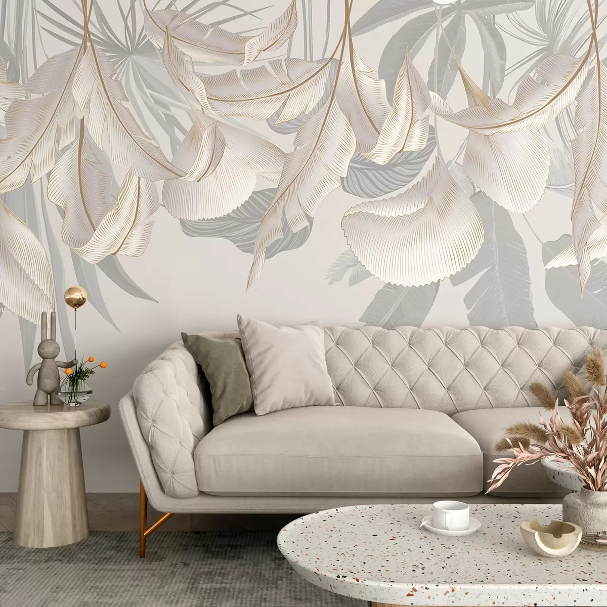 Papier peint De délicates feuilles tropicales florales blanches et grises créent un arrière-plan doux et éthéré N° w08217