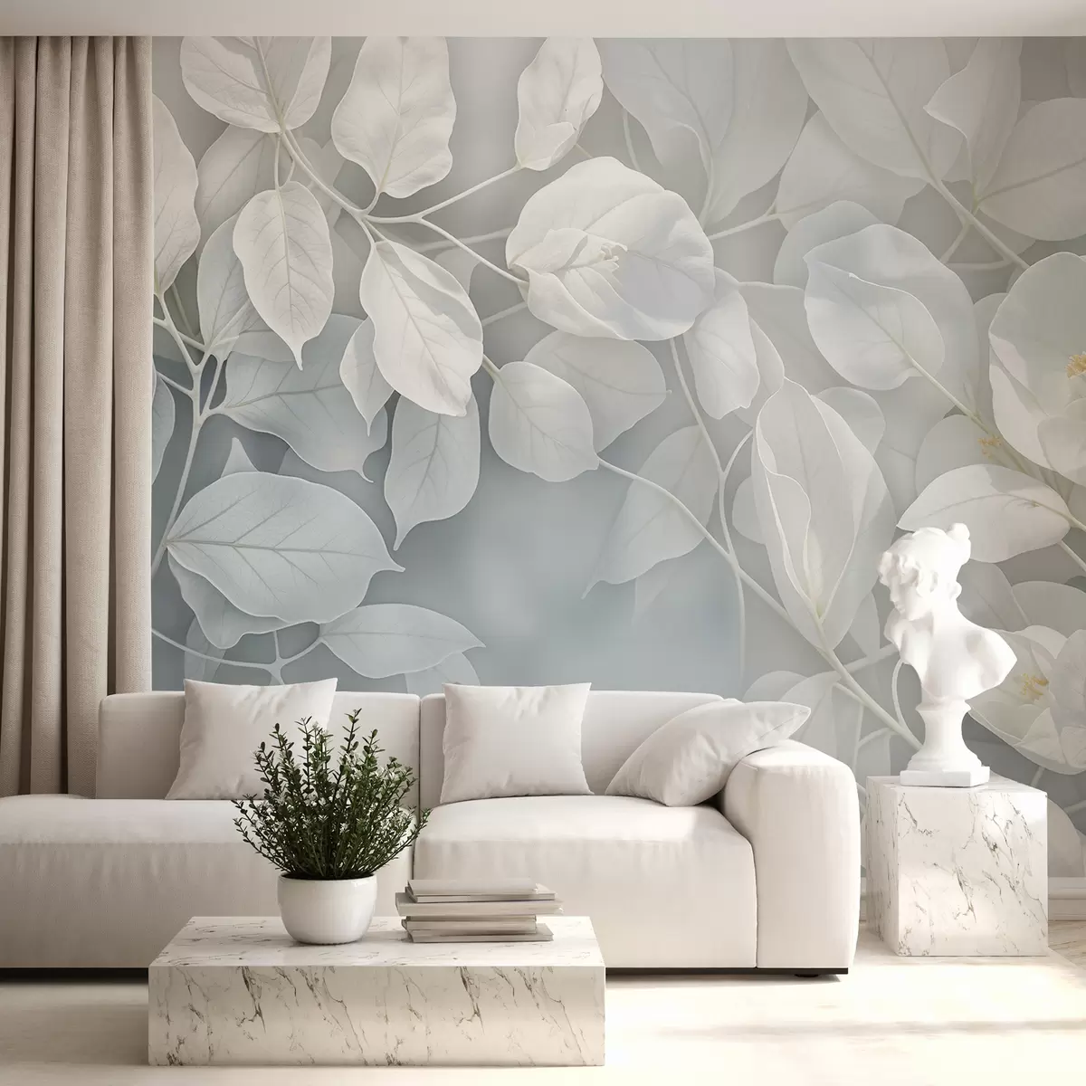 Papier peint Fleurs blanches douces et délicates avec des feuilles gris-vert sur un fond flou, créant une atmosphère sereine N° w08232