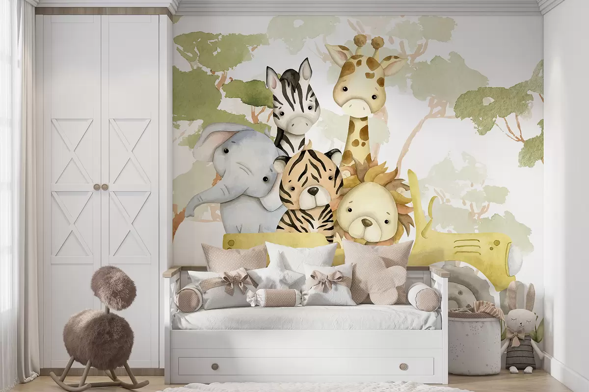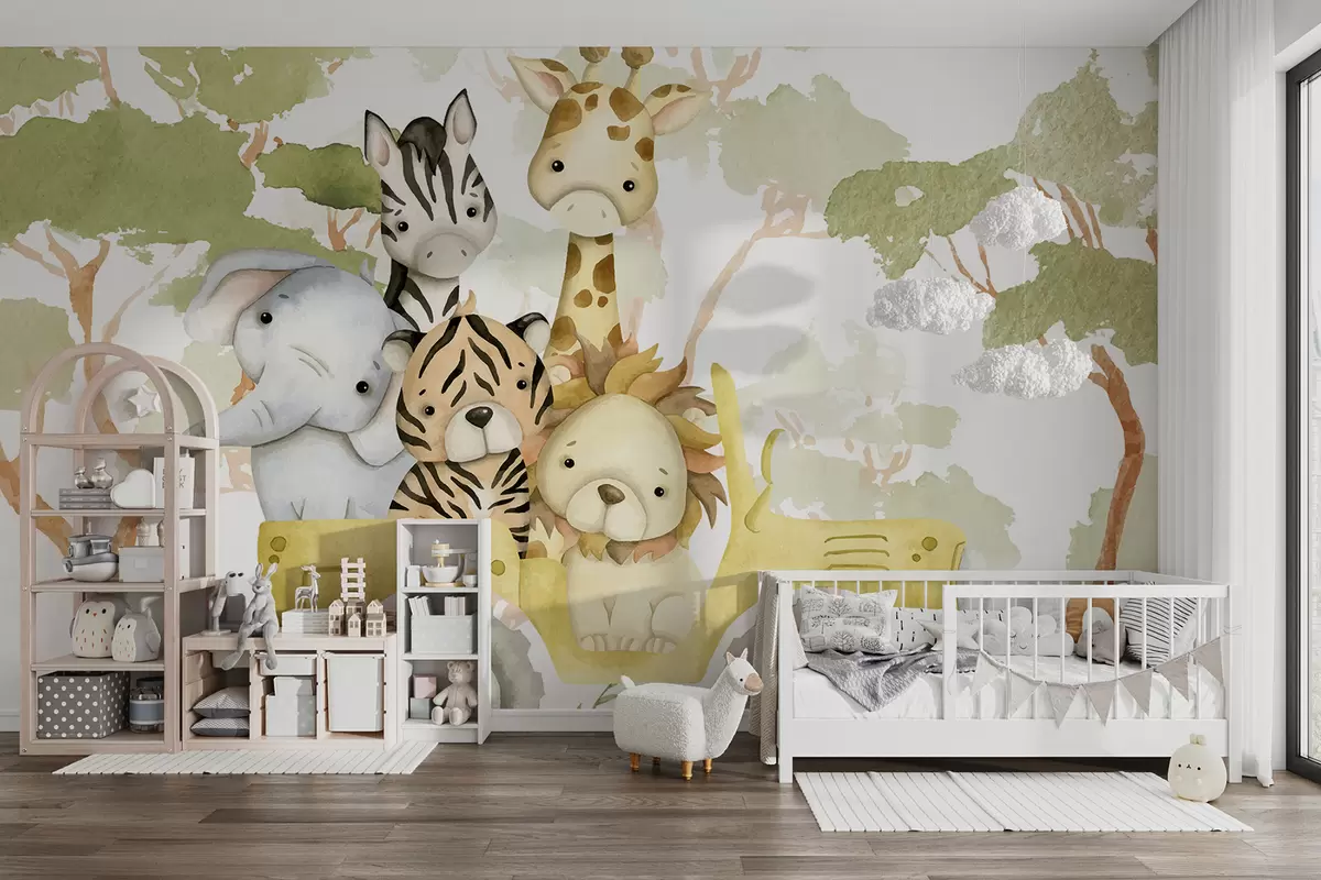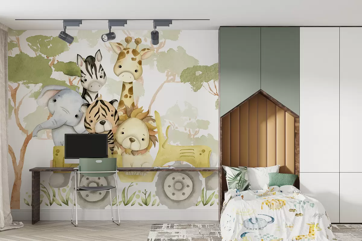 Papier peint Un camion jouet jaune transportant une girafe, un tigre, un lapin et un éléphant, sur un fond de feuillage vert N° w08233