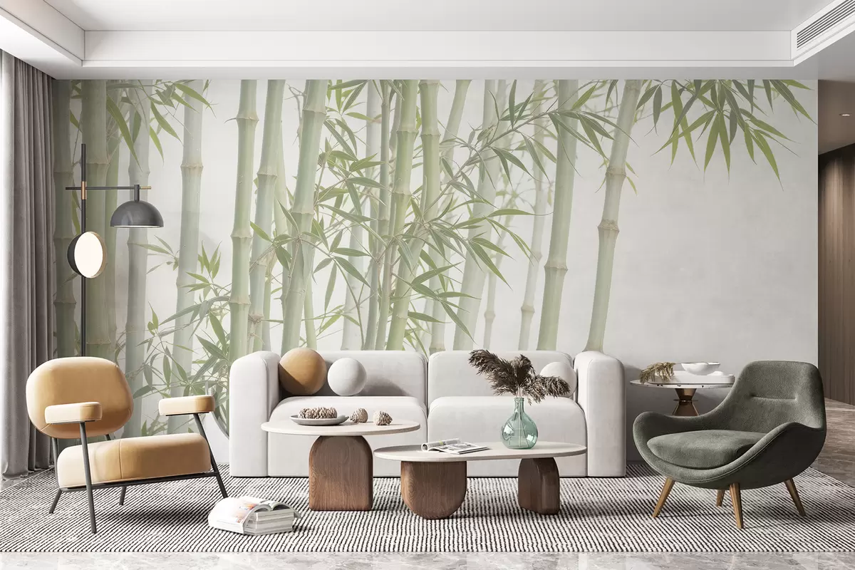Papier peint Une forêt de bambous dense avec de hautes tiges de bambou et des feuilles vertes sur un fond doux et brumeux N° w08237