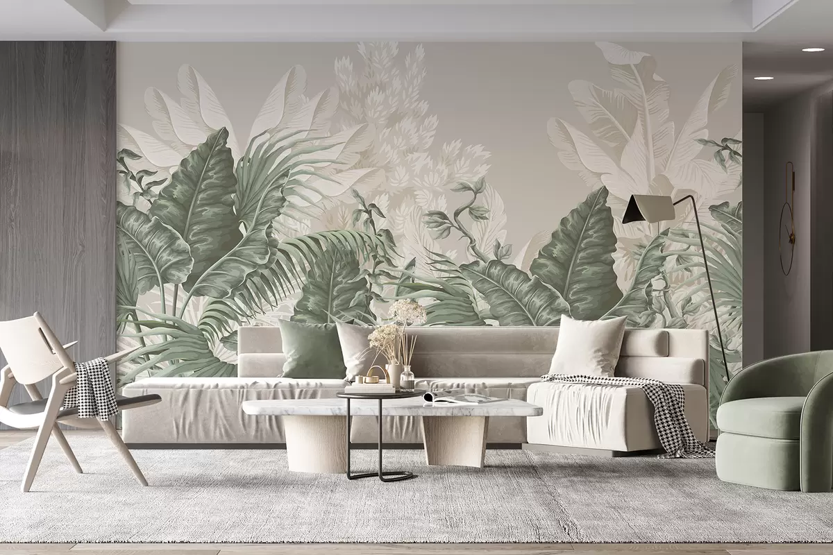 Papier peint Une scène de jungle tropicale avec de grandes feuilles vertes et des fleurs au premier plan, créant une atmosphère luxuriante N° w08242v1
