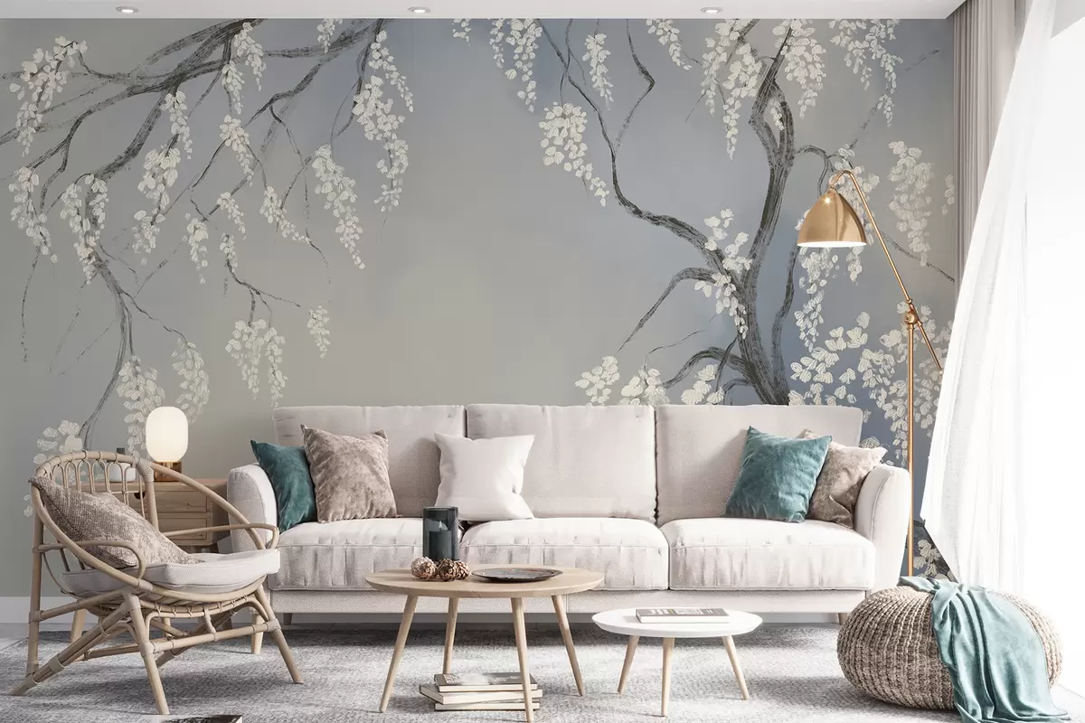Papier peint Cerisier blanc délicat avec des fleurs en fleurs sur des branches sur fond bleu N° w08243v1