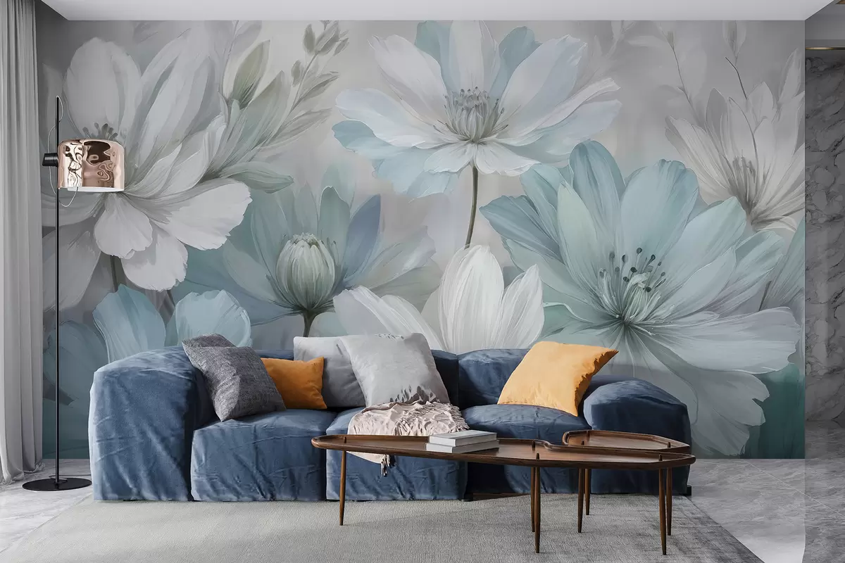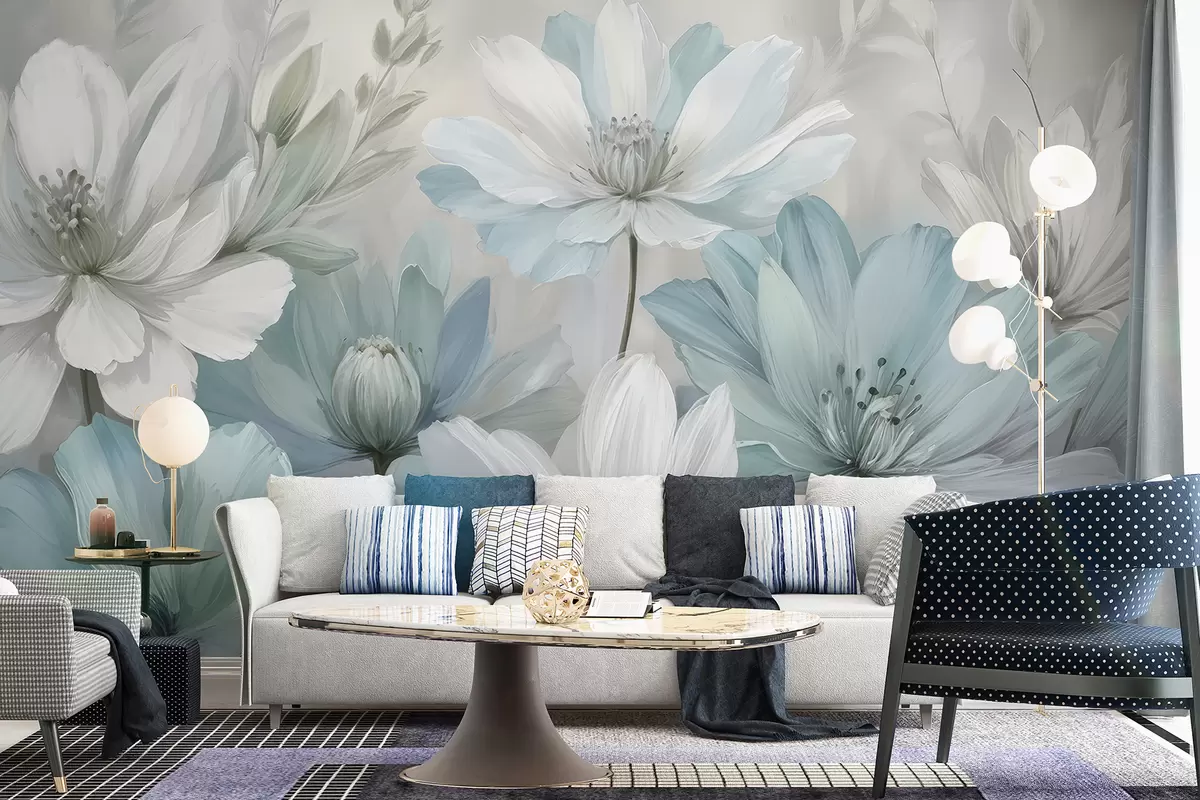 Papier peint Gros plan de fleurs blanches et bleu clair ressemblant à des marguerites, peinture artistique avec des arrière-plans doux et flous N° w08247