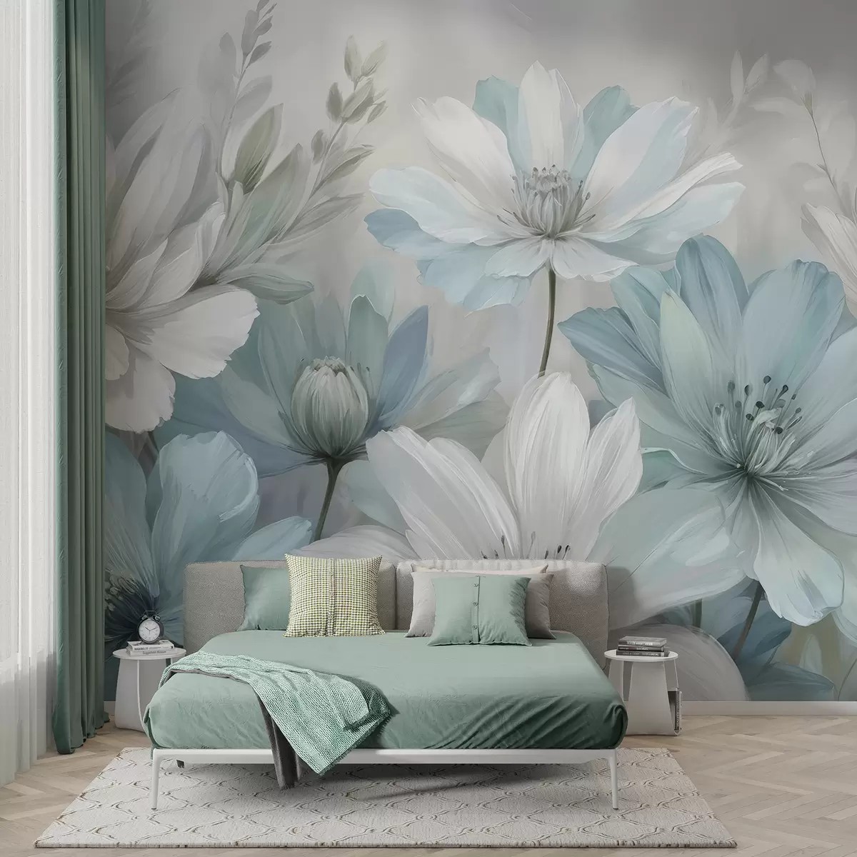 Papier peint Gros plan de fleurs blanches et bleu clair ressemblant à des marguerites, peinture artistique avec des arrière-plans doux et flous w08247