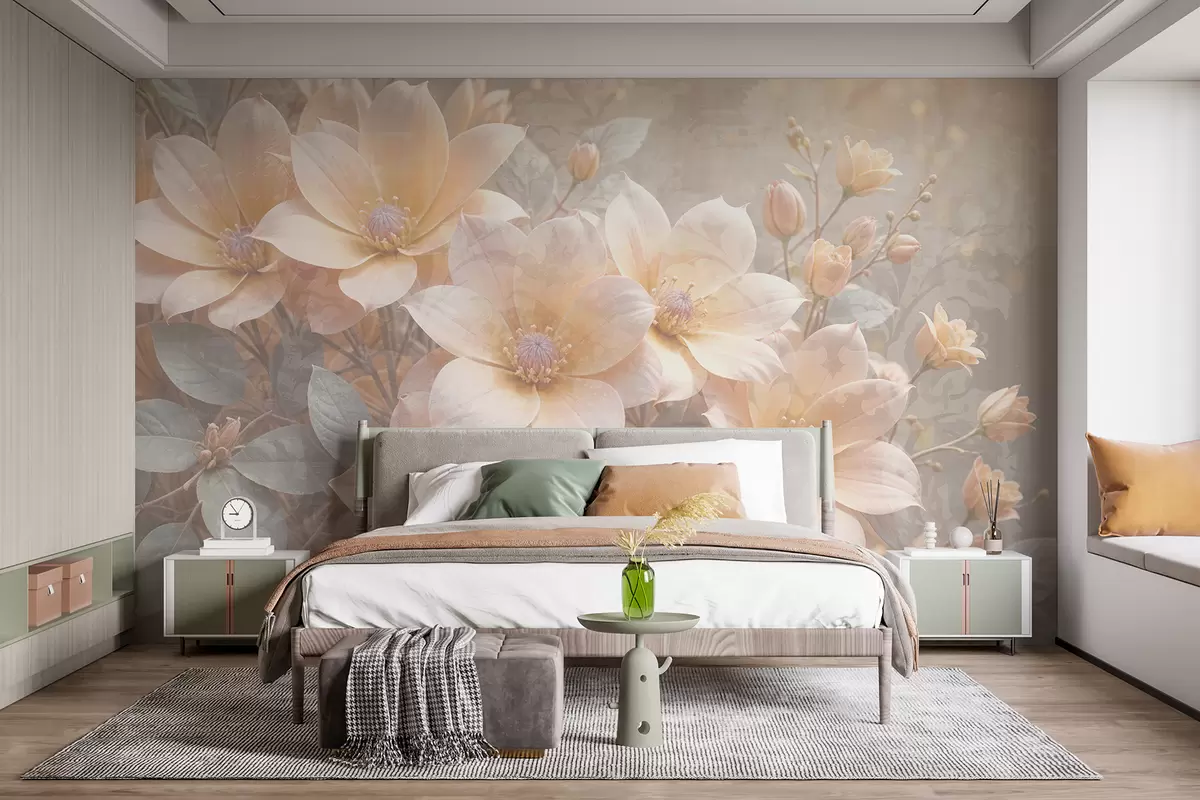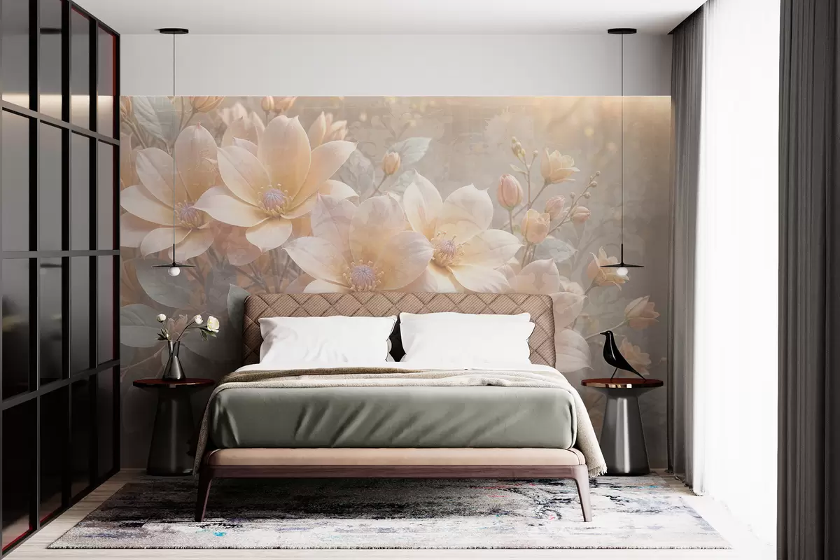 Papier peint Fleurs aux couleurs pastel et aux pétales délicats sur un fond texturé flou, créant une atmosphère sereine N° w08273