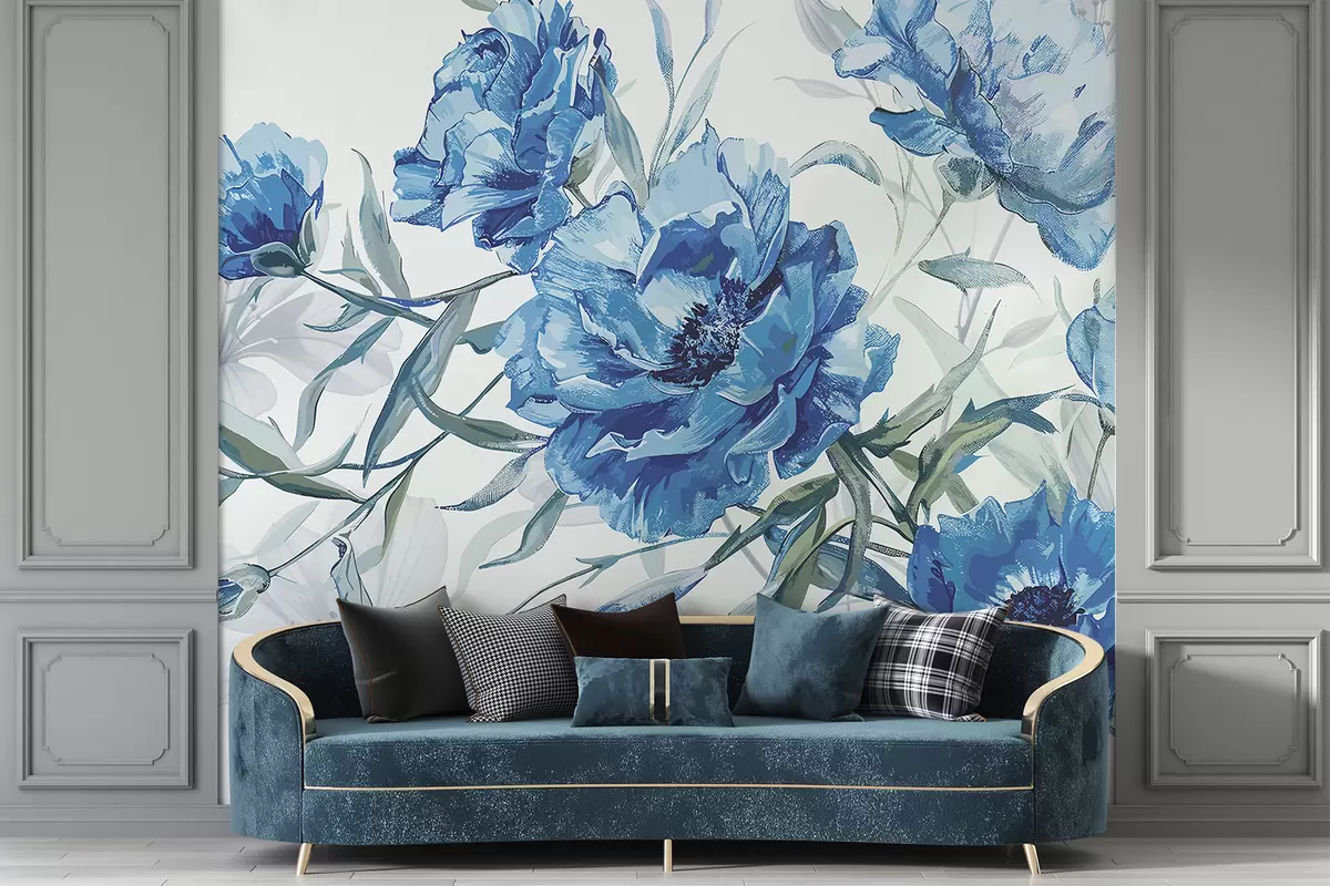 Papier peint Peinture de pivoines bleues avec un feuillage luxuriant sur un fond abstrait léger N° w08274v1
