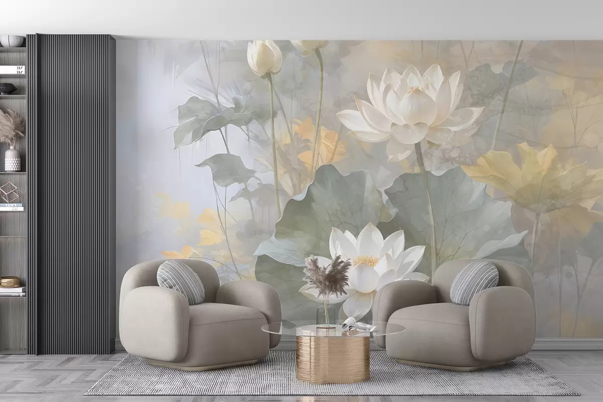 Papier peint Fleurs de lotus blanches avec feuilles dans un étang sur un fond jaune et vert flou et doux N° w08275