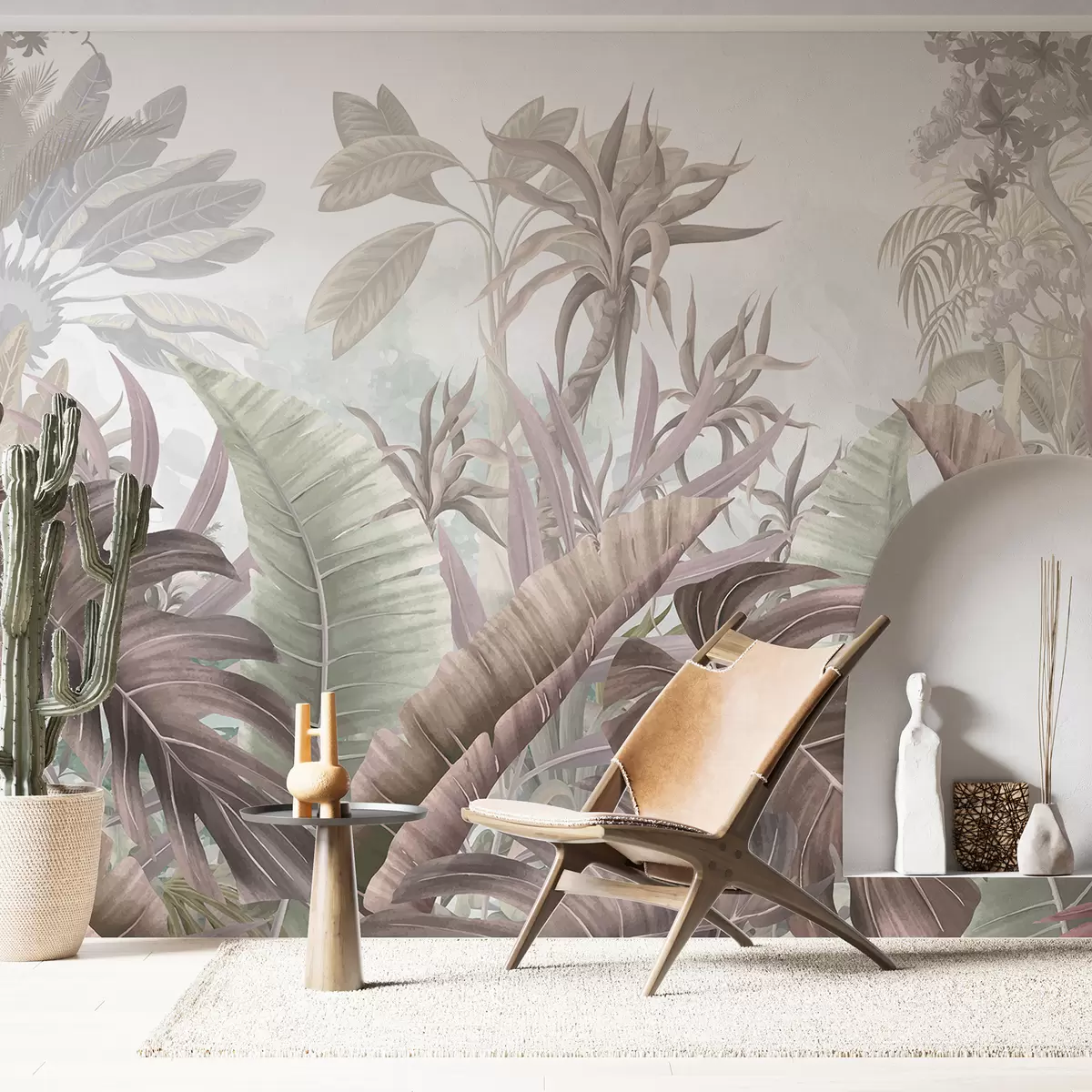 Papier peint Une jungle tropicale avec de grandes feuilles de palmier et des plantes exotiques dans des tons gris, blancs et beiges N° w08307