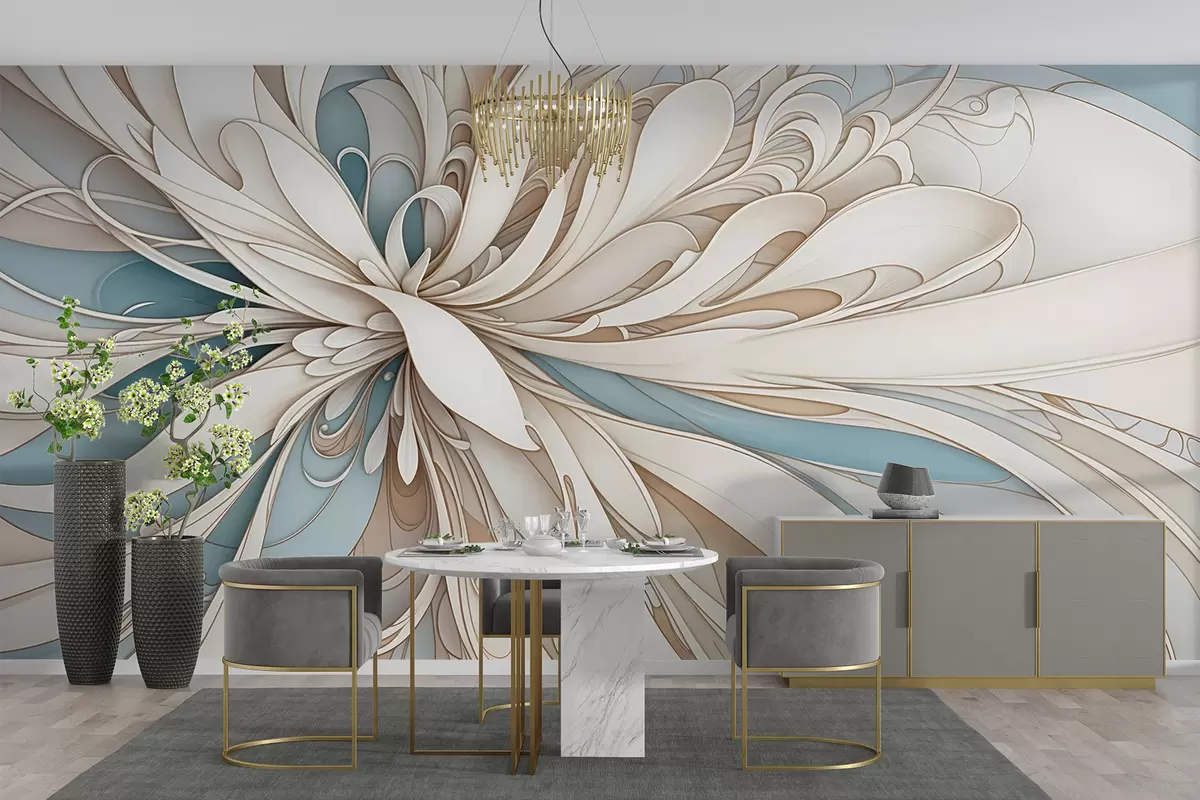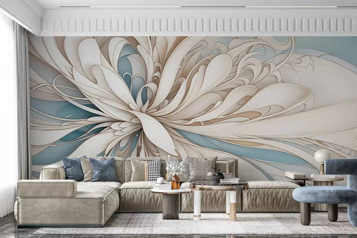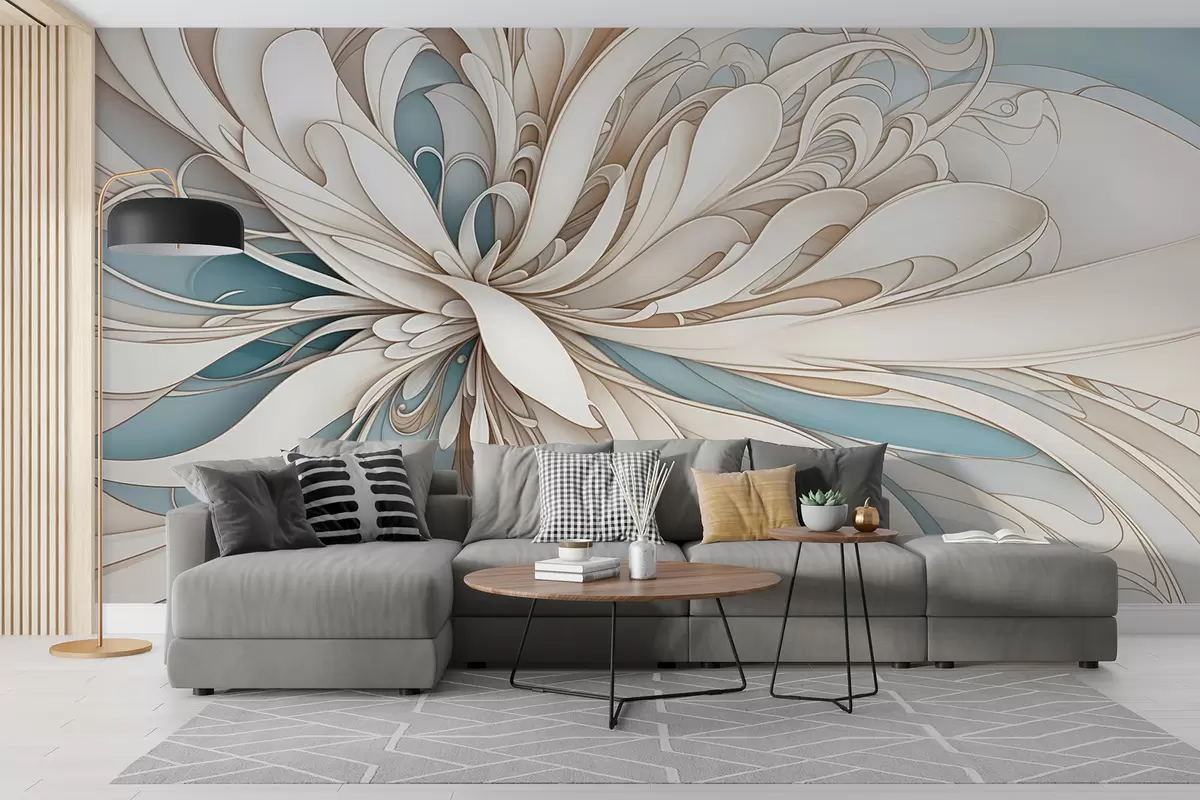 Papier peint Motif floral abstrait avec des formes organiques tourbillonnantes dans les tons beige, beige et bleu sur un fond clair N° w08311