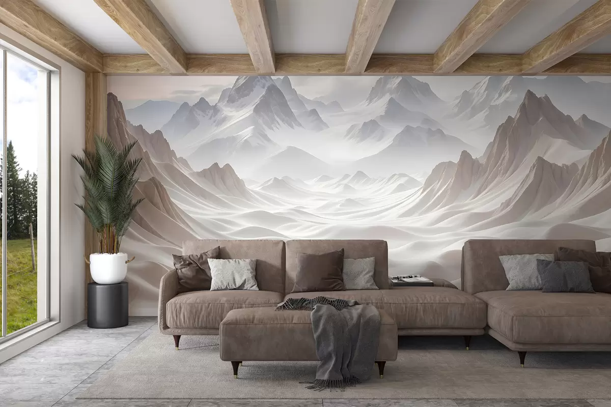 Papier peint Pics montagneux enneigés émergeant d'un paysage brumeux et éthéré de collines et de vallées ondulantes N° w08313