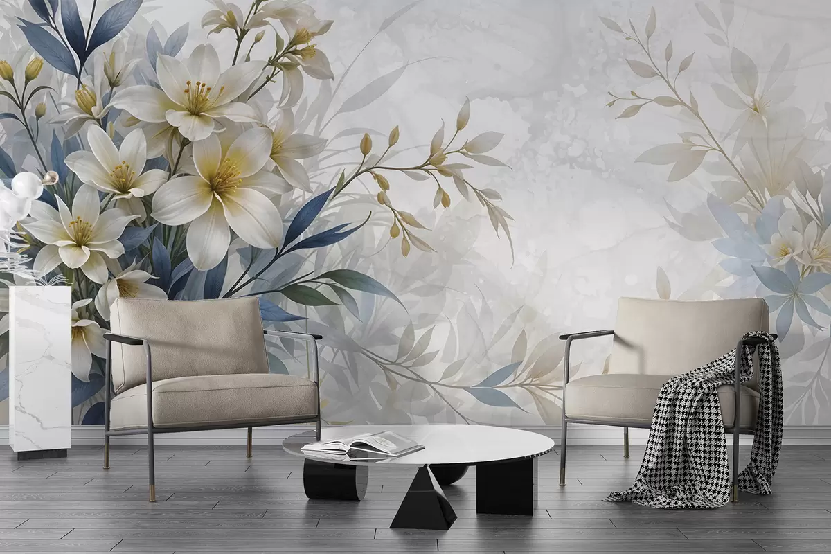 Papier peint Bouquet floral blanc, beige et bleu avec des feuilles délicates sur un fond doux et flou N° w08314