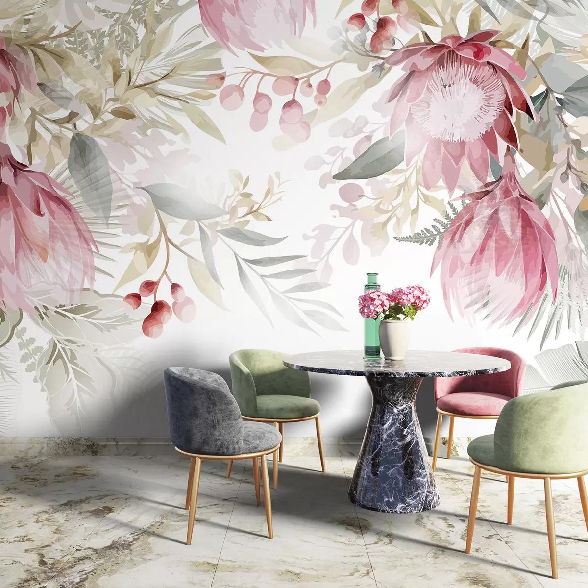 Papier peint Grands proteas roses et blancs transparents avec des feuilles vertes luxuriantes sur un fond clair N° w08315