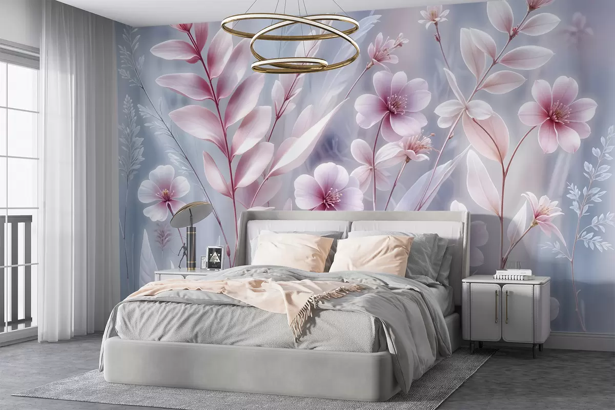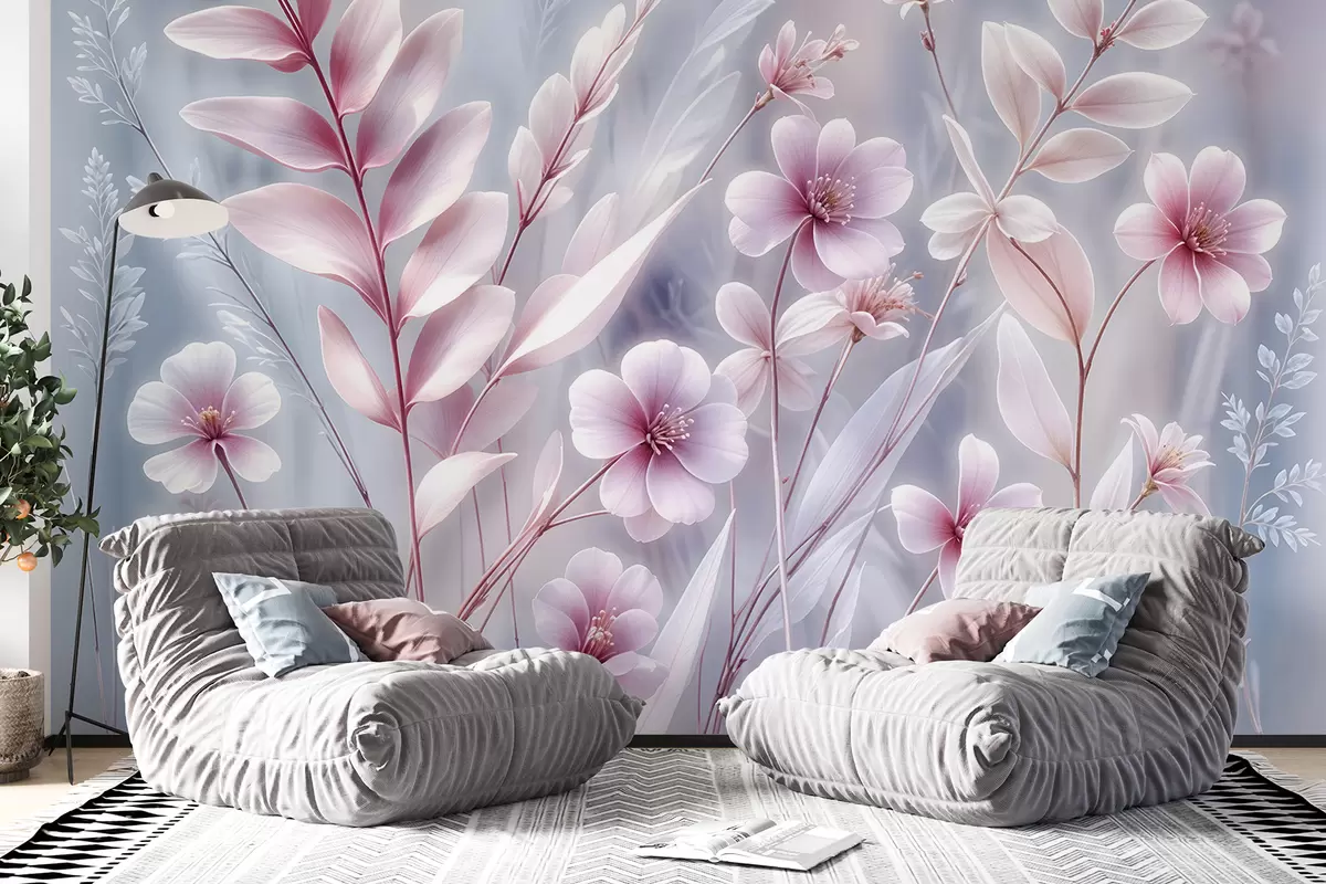 Papier peint Fleurs roses délicates et florales avec des pétales et des feuilles douces sur un fond abstrait gris pâle N° w08323